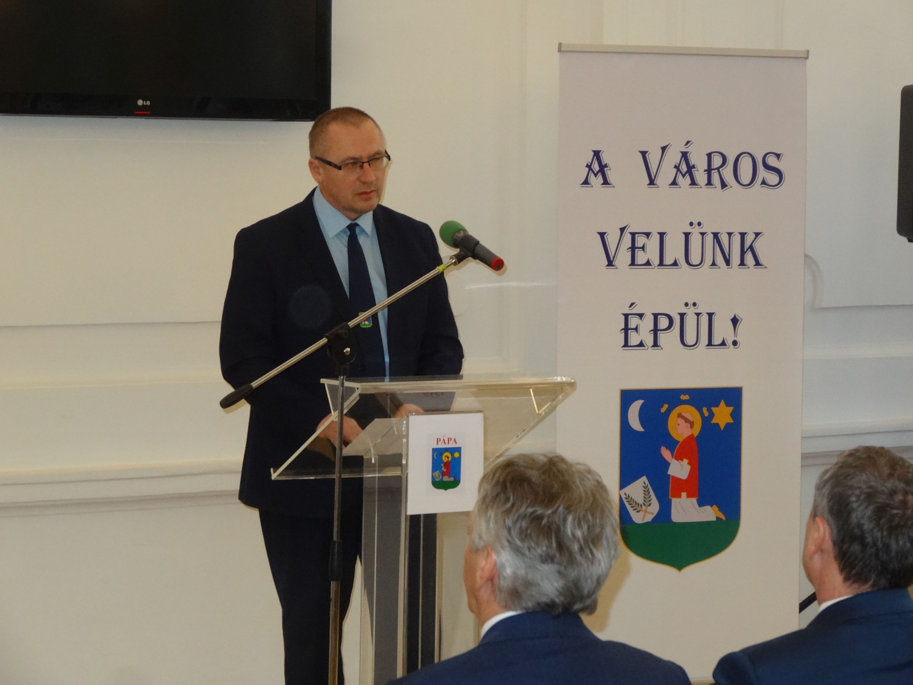 Dr. Kovács Zoltán országgyűlési képviselő köszöntőjében az országos gazdaságban tapasztalható biztató folyamatokról beszélt. Mint mondta, a gazdasági válságot követően sikerült stabilizálni, majd markáns növekedési pályára állítani a magyar gazdaságot és közben a költségvetési hiányt tartósan 3% alatt tartani. Kovács Zoltán pozitívan szólt a CSOK bevezetéséről, amely túl azon, hogy segít a lakásvásárlásban, az építőipar növekedéséhez is hozzájárul. A következő években Pápa térségébe érkező, tízmilliárd forintot meghaladó uniós fejlesztési forrás az államtitkár szerint ugrásszerű fejlődéshez segíti a vállalkozásokat, a településeket pedig élhetőbbé és kulturáltabbá teszi.
