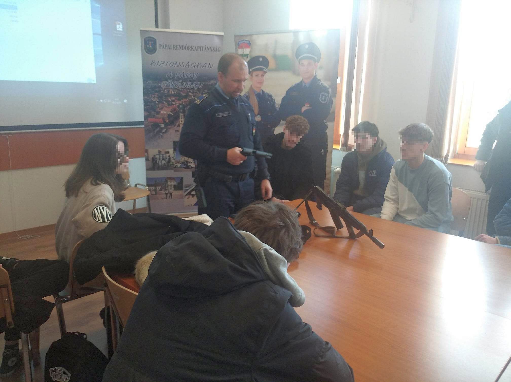 Ezt követően a diákoknak Bendes Attila rendőr százados, alosztályvezető mutatta be a Veszprém Vármegyei Rendőr-főkapitányságon belül a Pápai Rendőrkapitányságon működő Határrendészeti és Közbiztonsági Alosztály munkáját, valamint közreműködésével a fiatalok megismerkedhettek a rendőrségen rendszeresített fegyverekkel is. A nyílt nap a rendőrkapitányság udvarán folytatódott, ahol Kocsis József rendőr zászlós, kutyavezető várta a fiatalokat és tájékoztatta őket a szolgálati ebek kiképzési módszereiről. A rendezvény zárásaként a diákok felvilágosítást kaptak a szerződéses határvadász, valamint a 10 hónapos rendőrjárőr képzésről is.