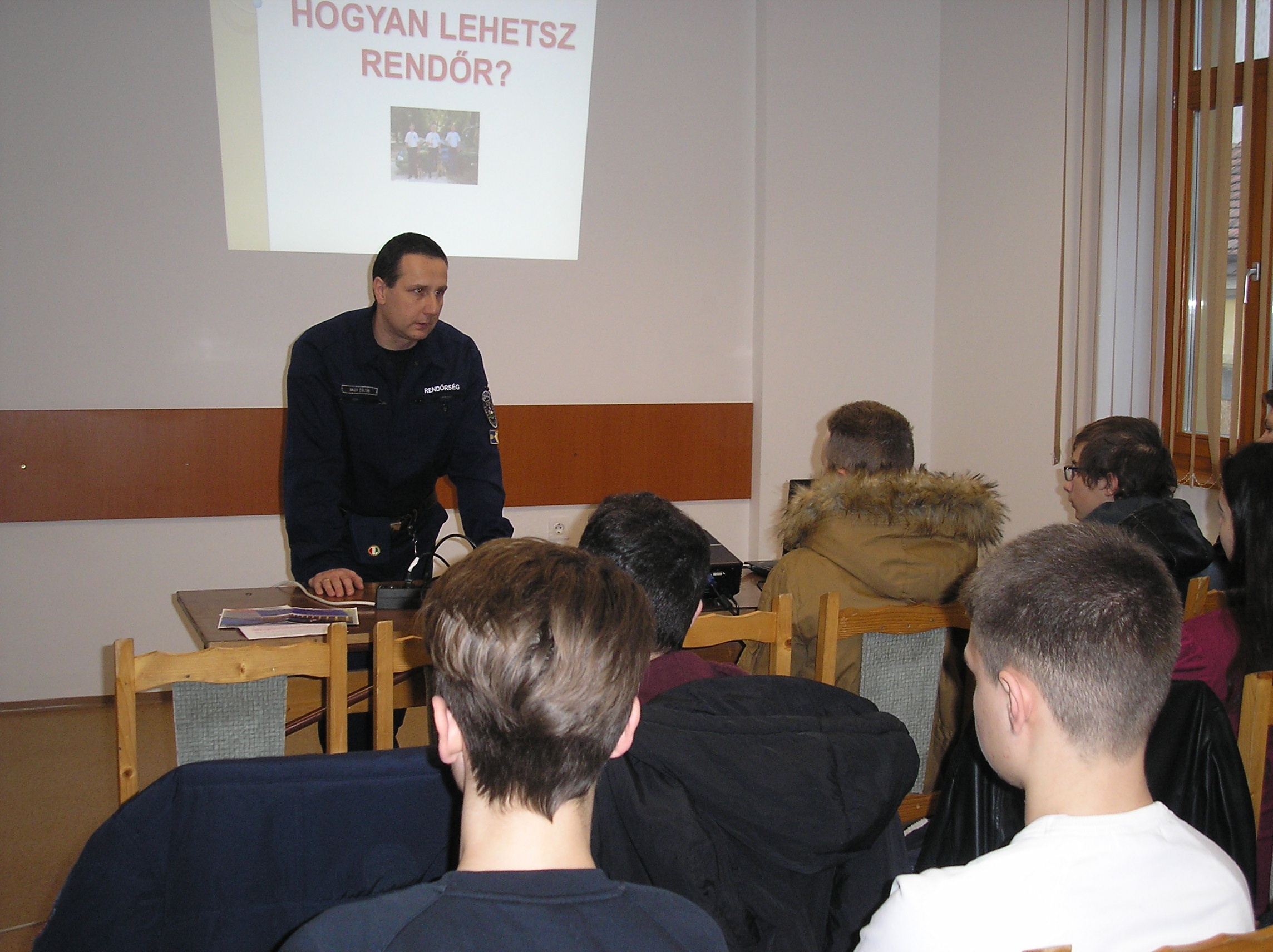 A Pápai Rendőrkapitányság toborzó csoportjának tagjai a rendőrkapitányság nagytermében fogadták a pápai középiskolákból érkezett több mint 50 diákot. Nagy Zoltán címzetes rendőr őrnagy kiemelt személyzeti főelőadó a jelenleg Magyarországon folyó rendészeti képzésekről és a határvadász szolgálati ágról tájékoztatta a fiatalokat, valamint felvilágosítást adott a jelentkezés feltételeiről. Ezt követően dr. Varga Balázs rendőr alezredes közlekedésrendészeti osztályvezető mutatta be a diákoknak eddigi rendőri pályáját, majd a toborzó nyílt nap az Adyligeti Rendészeti Szakgimnázium életét bemutató kisfilm vetítésével folytatódott. A rendezvény zárásaként az érettségi előtt álló diákok felpróbálhatták a csapatszolgálati eszközöket, megtekinthettek egy rendőrautót, valamint felkereshették az előállító helyiséget, ahol Fülöp Tamás rendőr őrnagy körzeti megbízotti alosztályvezető ismertette a helyiség rendeltetési célját.