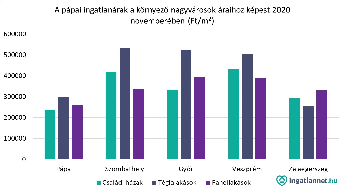 Jól látható, hogy a környéken található nagyvárosokhoz képest a pápai árak nagyon kedvezőek, megérheti itt ingatlant keresni, még akkor is, ha például a munkába tartó hosszabb ingázás lehet az ára. Egy 80 m2 alapterületű pápai téglalakást ugyanis 23,5 millió forint körül már találhatunk, míg Veszprémben ez az összeg akár 40 millió forintra is tehető annak ellenére, hogy a két várost csupán 50 km választja el egymástól.