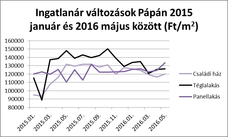 2015 január és 2016 január között az eladó pápai családi házak átlagos Ft/m2 árai dinamikusan – 33%-kal – emelkedtek. A téglaépítésű lakások egy hanyatló tendencia után 16%-kal drágultak, a panellakások árai pedig egy folyamatosan váltakozó tendenciát mutatva összességében 4%-kal emelkedtek egy év alatt. 2016 január és május között országos szinten egy lényegesen visszafogottabb -5-6%-os - növekedés mutatkozott. Ez a tendencia Pápán nem érvényesült minden ingatlantípusnál, a családi házak és a téglalakások piacán 5%-os csökkenés jelentkezett, a panellakások viszont 6%-kal drágultak.