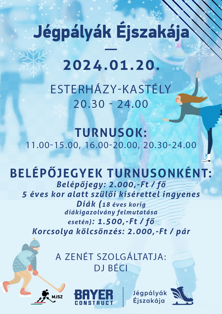 2024. január 20-án országszerte több tucat jégcsarnok és jégpálya csatlakozott a Jégpályák Éjszakája elnevezésű akcióhoz, melynek keretében egyedi programokkal, játékokkal és meglepetésekkel várnak mindenkit szombaton este. Mi, pápaiak igazán büszkék lehetünk a korcsolyapályánkra, hiszen az ország lehangulatosabb jégpályái közé választották a pápait, s valóban, a nappali korizásnál már csak egy éjszakai lehet jobb az Esterházy-kastély ölelésében, fényekkel, zenével.