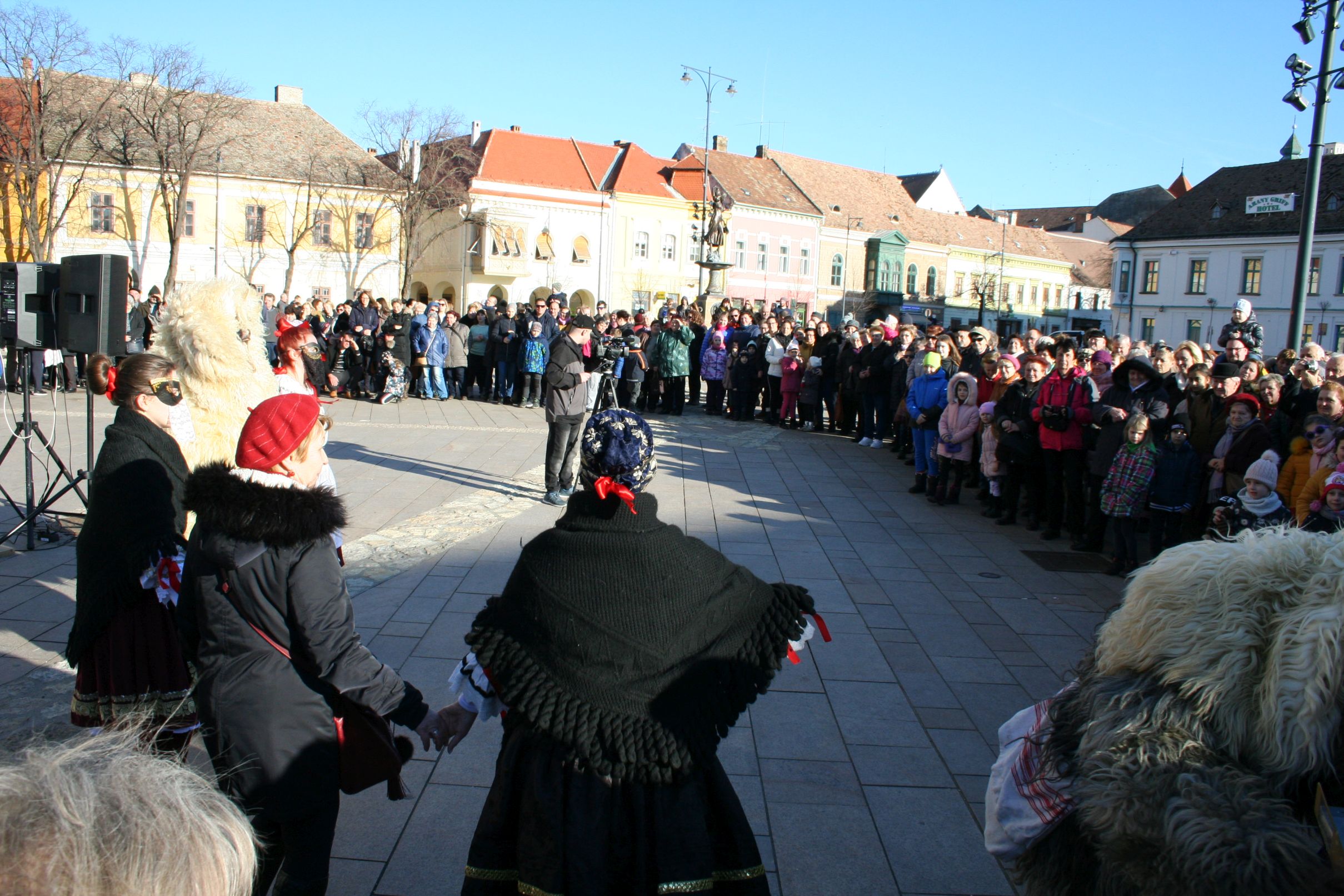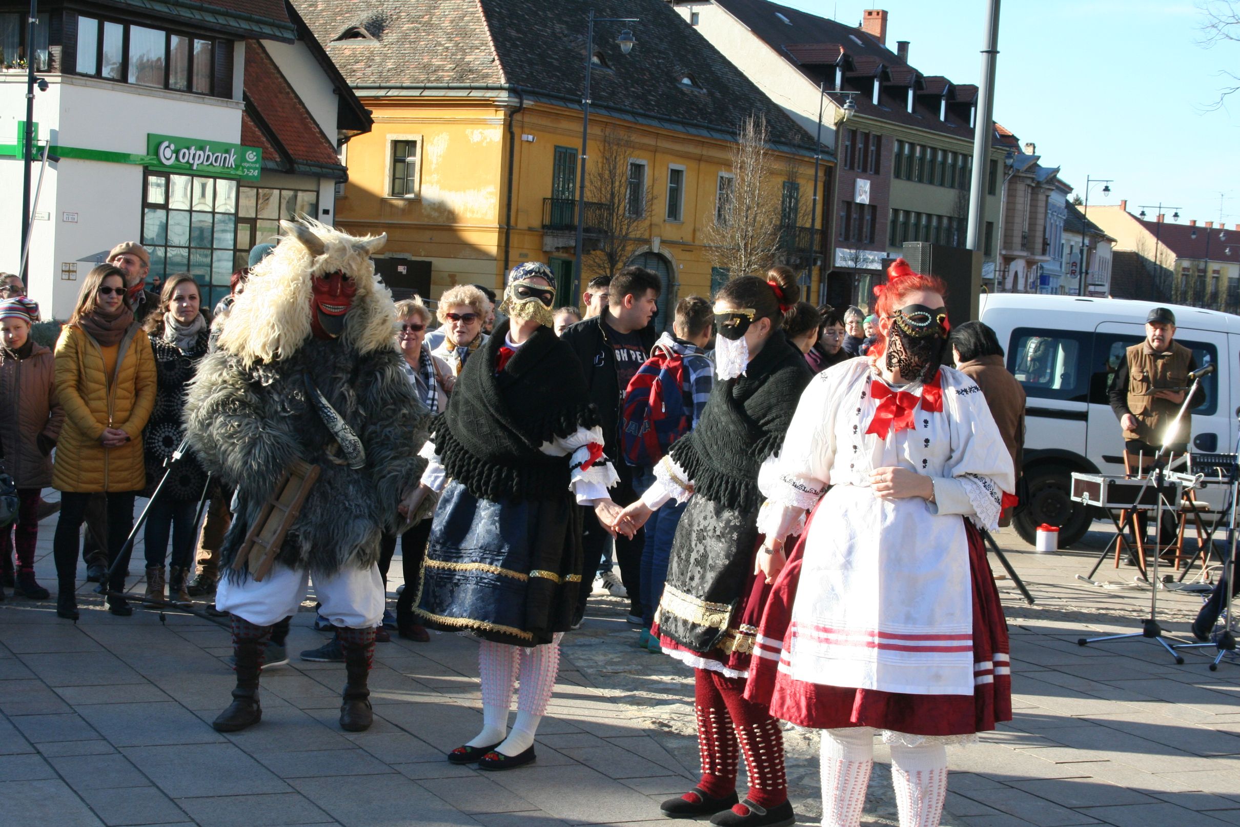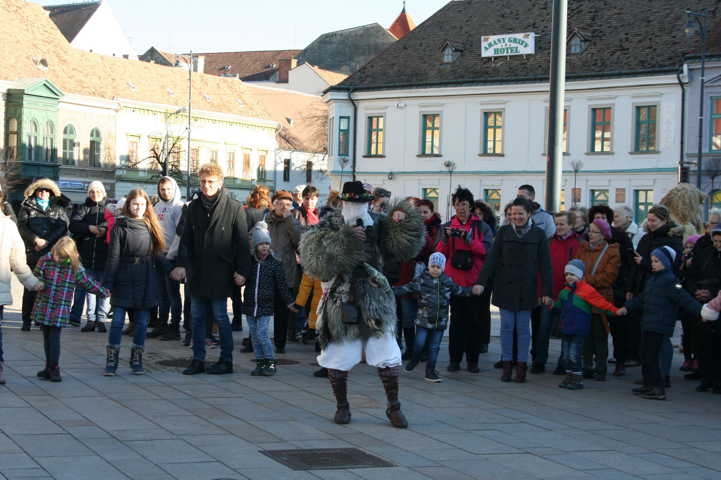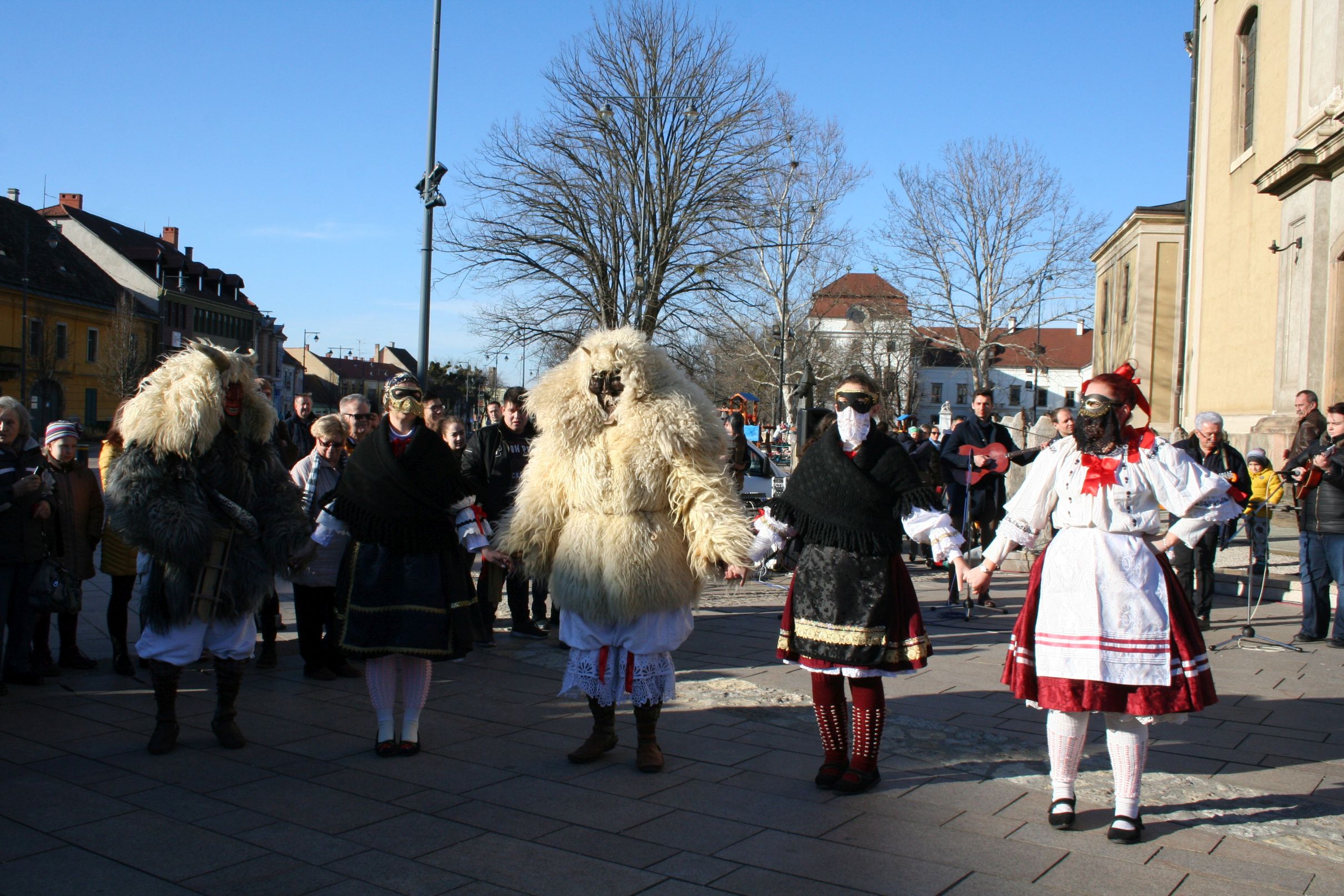 A mohácsi busók néhány képviselője tartott bemutatót és táncházat a pápai Fő téren, a Pegazus Színház farsangi programjainak keretében.