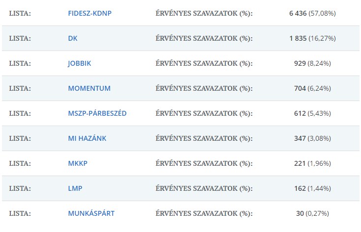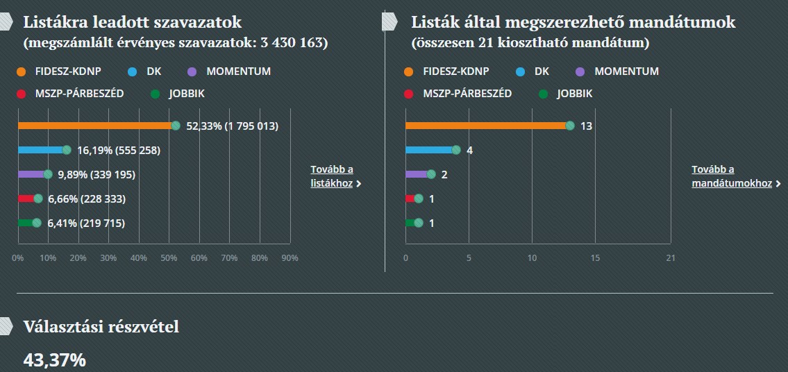 Országos szinten egyértelmű a Fidesz fölénye, a párt majd' 1,8 millió szavazatot kapott és 13 képviselőt küldhet az EP-be. Meglepő, hogy a DK 16 %-ot és 4 mandátumot szerzett, a Momentum lett a harmadik, az MSZP-P csak a negyedik, a Jobbik pedig az ötödik, egy-egy mandátumot szerezve.