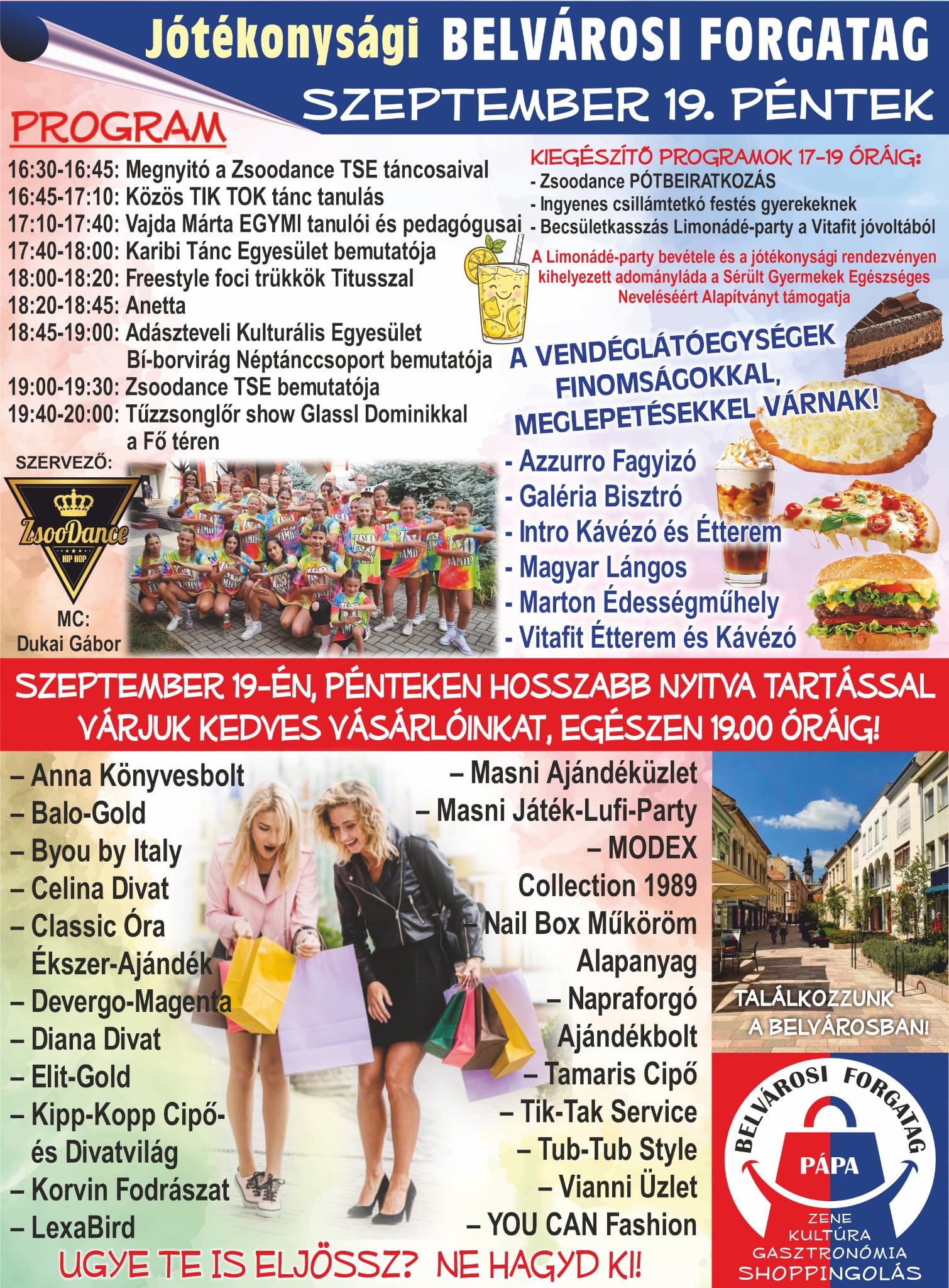 A belvárosi üzletek összefogásában hónapró-hónapra szerveződő rendezvényeknek nem kisebb célja van, mint a pápai belváros felélesztése, élettel való megtöltése. A Belvárosi Forgatagban olyan amatőr fellépők mutathatják meg magukat, akik lelkesedésükkel és tehetségükkel mindig képesek új színt vinni a rendezvénybe, a belvárosi üzletek pedig hosszabb nyitva tartással és akciókkal várják a vásárlókat. Érdemes a vendéglátóhelyeket is felkeresni ilyenkor, hiszen ők is mindig készülnek valamilyen meglepetéssel a forgatag résztvevőinek.