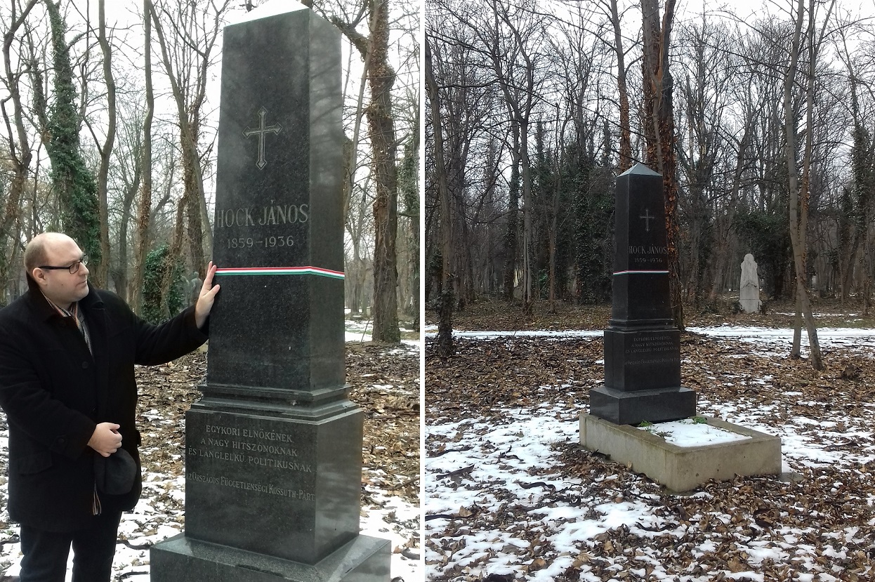 A hetvenhét esztendős korában elhunyt „ősi kurucálmok tárogatósa”, a rákóczista-kossuthista, az atyja erős negyvennyolcas függetlenségi- ellenzéki temperamentumát továbbvivő, „aranyszájú”, szürke reverendás nemzeti tanácsi elnök a budapesti, Fiumei úti nemzeti sírkertben, vagy más néven a Kerepesi úti temetőben – a Kossuth Lajos földi maradványait őrző mauzóleum közelségében – lel végső nyugvóhelyre. Fekete gránit síremlékét az Országos Függetlenségi Kossuth Párt készítteti el „egykori elnökének, a nagy hitszónoknak, és lánglelkű politikusnak” – fölirattal. Máig így olvasható rajta! Egy 2019-es, zord januári napon, fölutazva Hock egykori diákvárosából, Pápáról, megkeresve síroszlopát, egy nemzeti színű szalaggal kötöttem át azt, – s közben ekképp tűnődtem el: vajon mikor lehetett utoljára szervezett főhajtás körülötte, hivatalos koszorú-elhelyezés (?). Előzetesen, az interneten, egy régebbi fotót találva még sűrű bokrokat, indákat láttam a síremlékhely körül, de aztán csodák-csodájára ott jártamkor már föltűnő rendezettséget, tisztaságot tapasztaltam – s ezért köszönet illeti a sírkert dolgozóit (!) –, azonban a síremlék-föliratot is jó volna láthatóbbá tenni valamikor. Fontosnak tartom megemlíteni, hogy a Nemzeti Örökség Intézete tavalyra – a ’18-as forradalom centenáriumára – Károlyi Mihályék mauzóleumát példásan fölújította, amely szintén a Hock-sírtól nem messze magasodik. Nem szabad elfelednem megemlíteni azt sem, hogy szerencsére még utcák is viselik Hock nevét az országban; például Budapest-Józsefvárosban, Budapest-Kőbányán, Zalaegerszegen, Törökszentmiklóson, Csongrádon, Siófokon. Kilenc esztendeje, 2010 februárjában, születésének 150. évfordulója aktualitásaként Kőbányán pedig még emléktáblát is kapott. (Talán megérdemelhetne hasonlókat Devecser, Dáka, vagy Pápa településeken is, ahová ugyebár szintén szoros kötődései voltak…)
