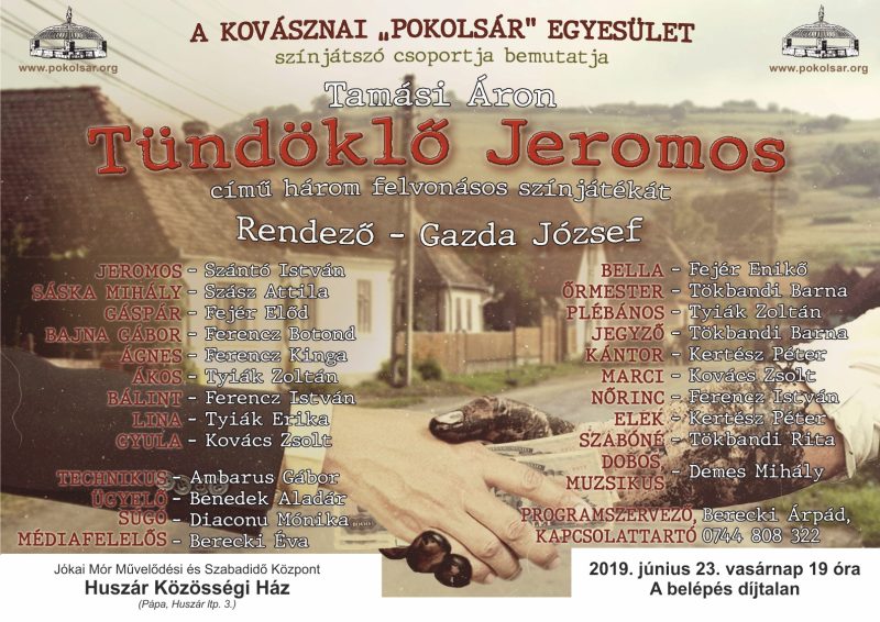 A Kovásznai "Pokolsár" Egyesület színjátszó csoportja bemutatja Tamási Áron: Tündöklő Jeromos című színjátékát Pápán, a Huszár Közösségi Házban. A program vasárnap lesz és a belépés díjtalan!