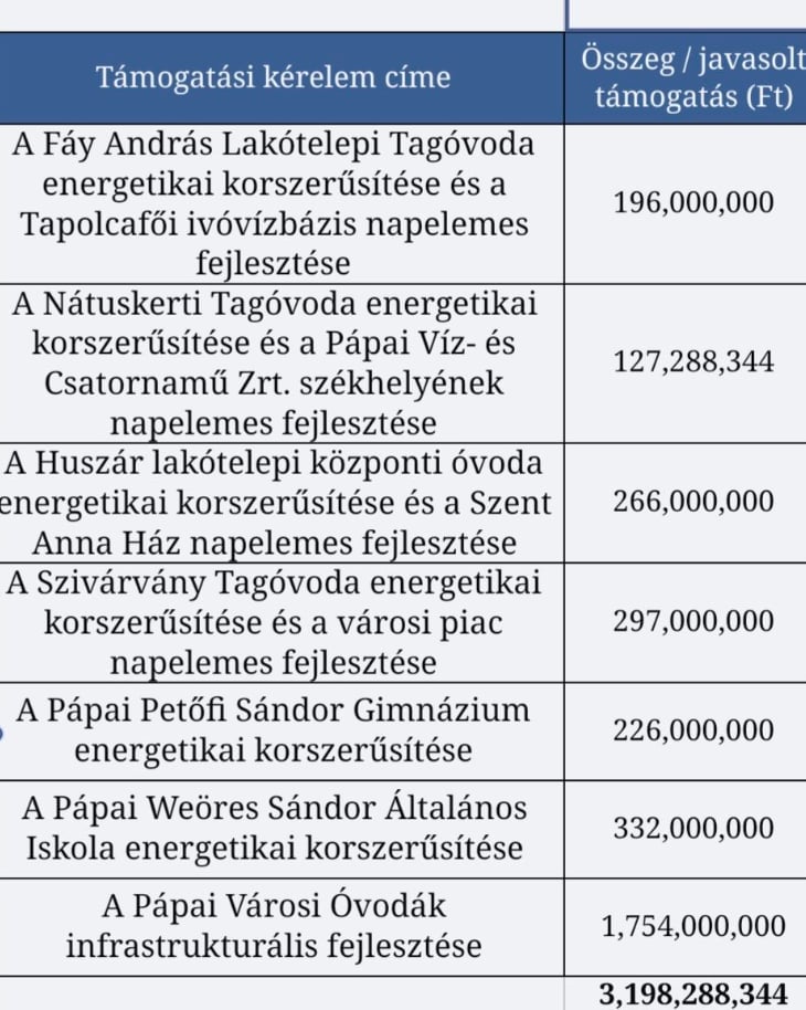 3,2 milliárd forintból óvodák, iskolák újulnak meg, valamint a Pápai Vízmű energetikai fejlesztésére is jut forrás.