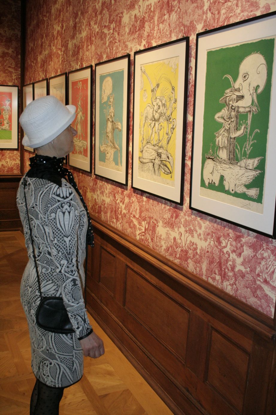 Már a kastély keleti szárnyában található időszaki kiállítóterek bejáratánál érezhető volt, hogy itt valami egészen másról van szó, mint egy átlagos kiállítás esetében. A férfiak egy-egy pálcikára rögzített bajszot, míg a hölgyek álarcot kaptak, ezek hiányában ugyanis nem lehetett belépni a termekbe. Bagettet sem lehet minden kiállításmegnyitón enni, ám mivel Dalínak ez volt a kedvence és szinten mindenhová vitt egyet magával, egyértelmű volt, hogy a francia étel a kiállításáról sem hiányozhat. Dalí készített illusztrációt tarot kártyára is, ezért a vállalkozó kedvűeknek egy jósnő is a rendelkezésére állt.