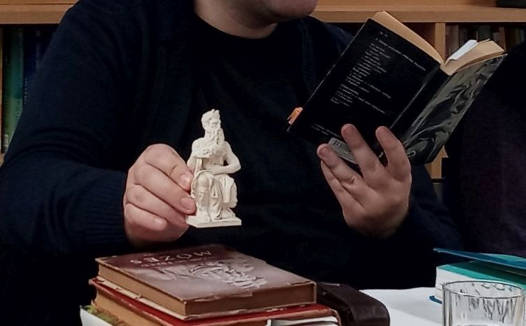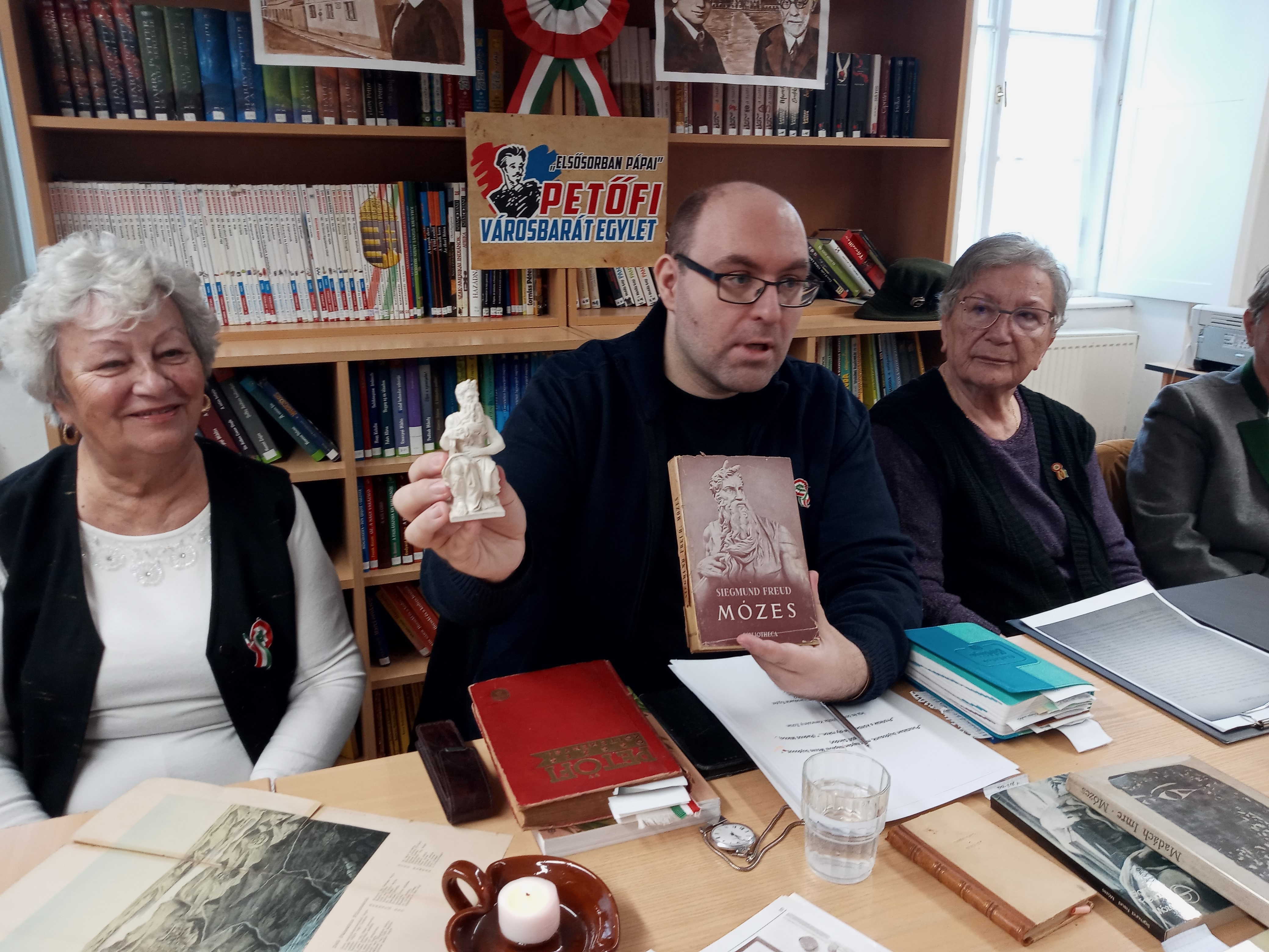 Sigmund Freud Mózes című könyvéből is elhangoztak részletek; Michelangelo Buonarroti egyik legklasszikusabb alkotásának, a római San Pietro in Vincoli templomban található Mózes-szobrának kicsinyített mását is bemutatta a jelenlévőknek Kerecsényi Zoltán, mint mondta, száztíz évvel ezelőtt, az eredeti szobor előtt állva, tűnődve szentelte Sigmund Freud élete utolsó nagy munkáját Mózesnek, hogy kutassa, vizsgálja annak kilétét és képességeit. De más művek segítségével is elgondolkodtak az egyletiek az óriási igazság- és szabadságszerető pátriárka máig ható példáján.