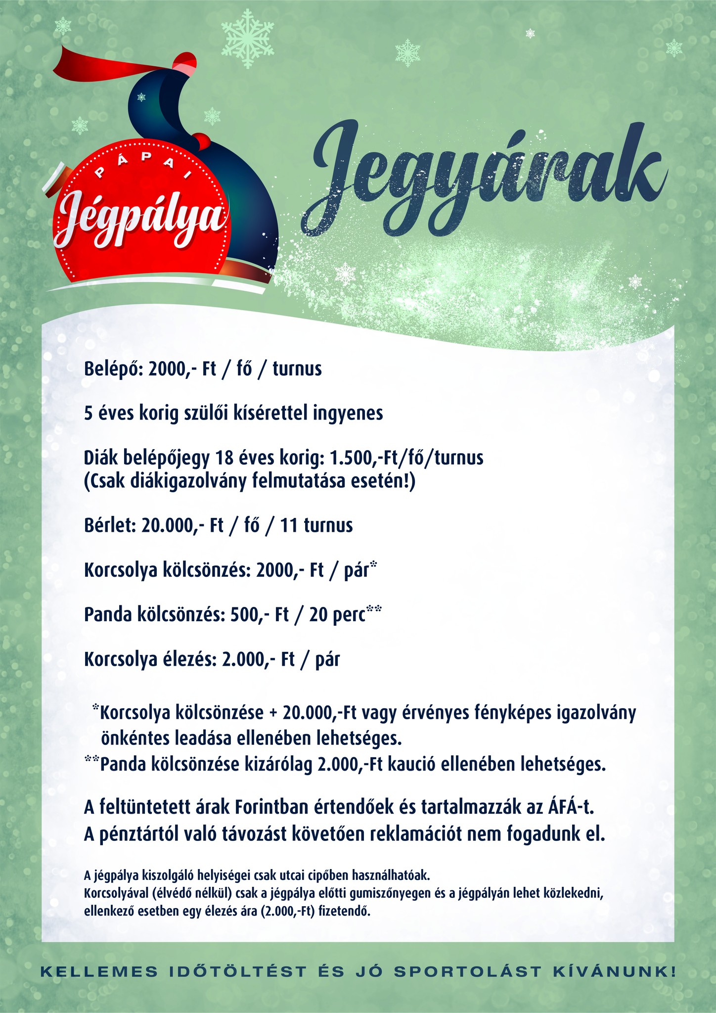 Az ország egyik leghangulatosabb jégpályája a következő árakkal és szolgáltatásokkal várja a téli sport szerelmeseit: