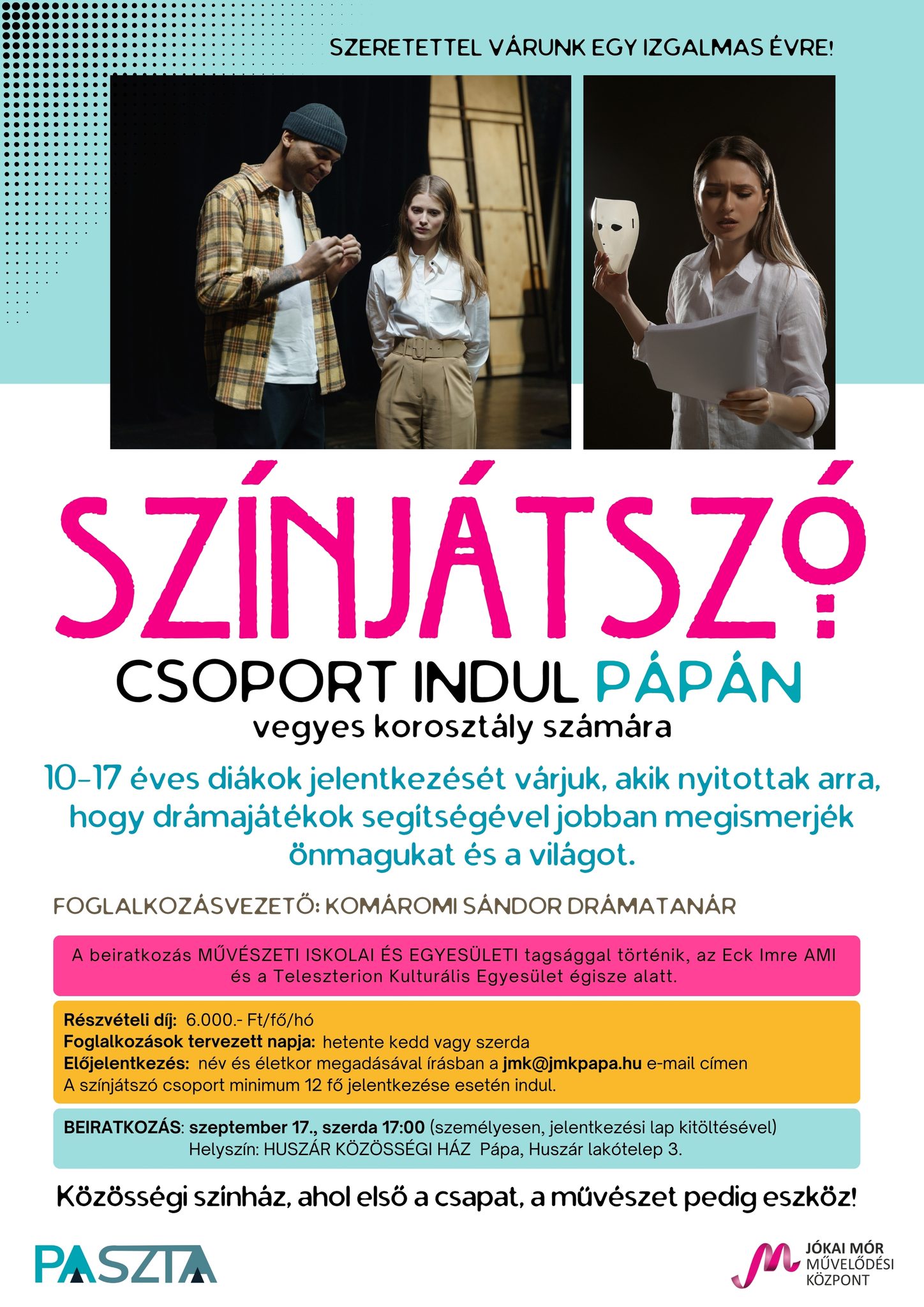 10 és 17 év közötti fiatalok jelentkezését várják az induló színjátszó csoportba, olyanokét, akik nyitottak arra, hogy drámajátékok segítségével jobban megismerjék önmagukat és a világot. A foglalkozásokat Komáromi Sándor vezeti.
