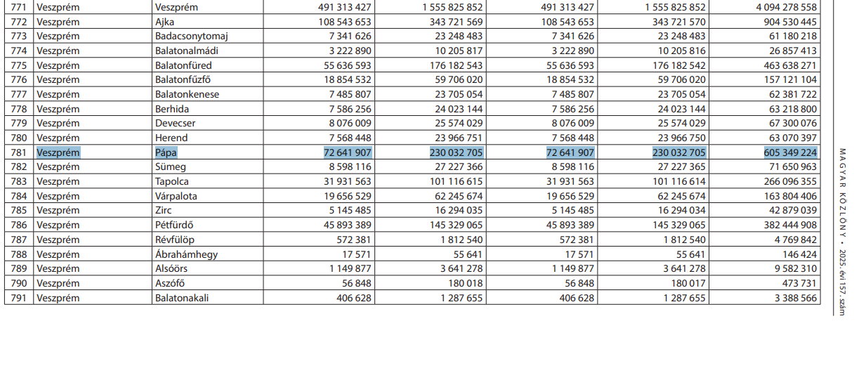 Pápa esetében is emelkedik a szolidaritási adó mértéke, miközben a város bevételei stagnálnak vagy éppen csökkennek.Míg 2022-ben 260, 2023-ban 393 millió forint volt a szolidaritási hozzájárulás Pápa esetében, addig tavaly már 507 millió forintot kellett fizetnie a városnak. 2025-ben 581 milliót, jövőre pedig egészen pontosan 605 349 224 forintot.