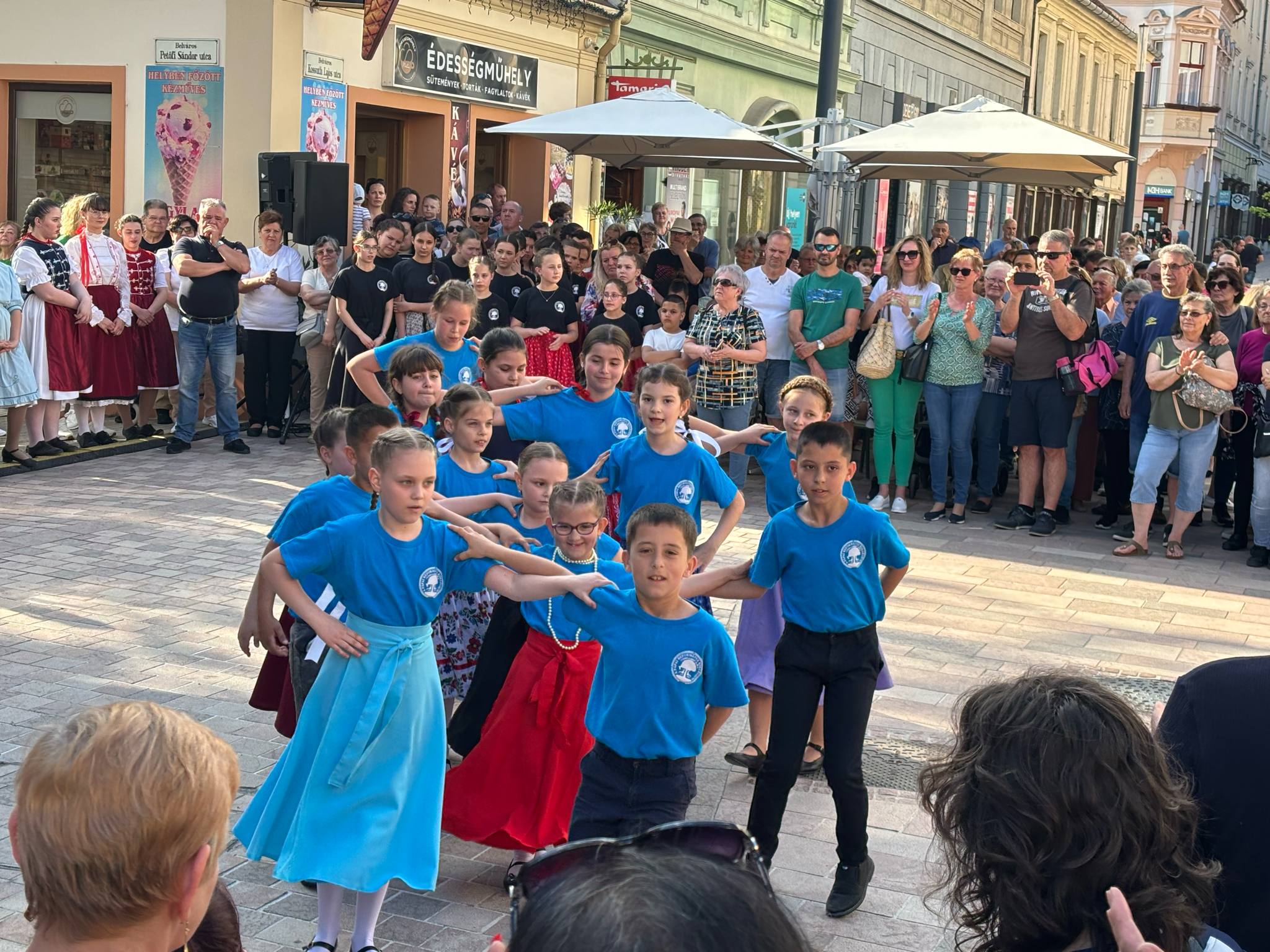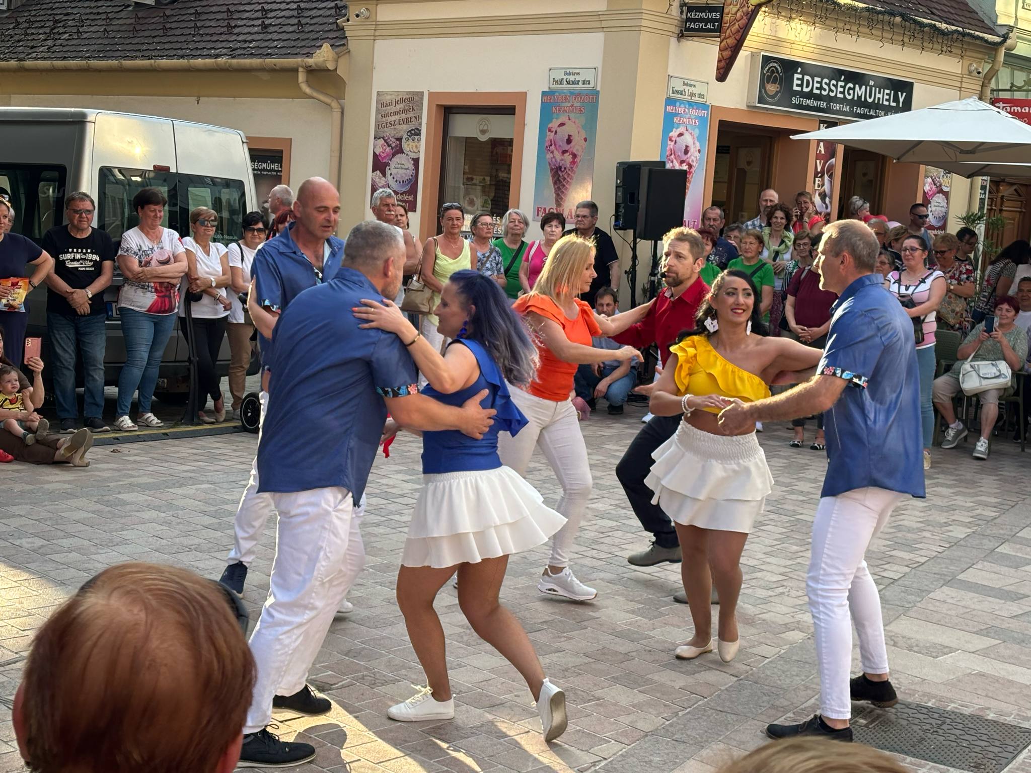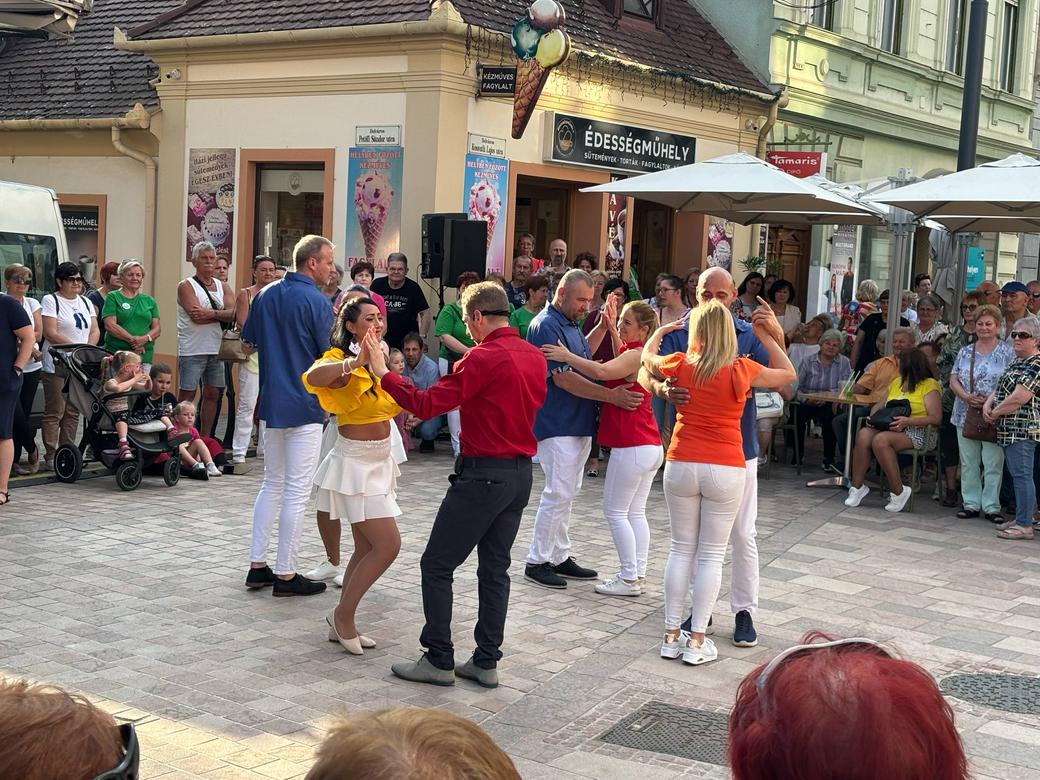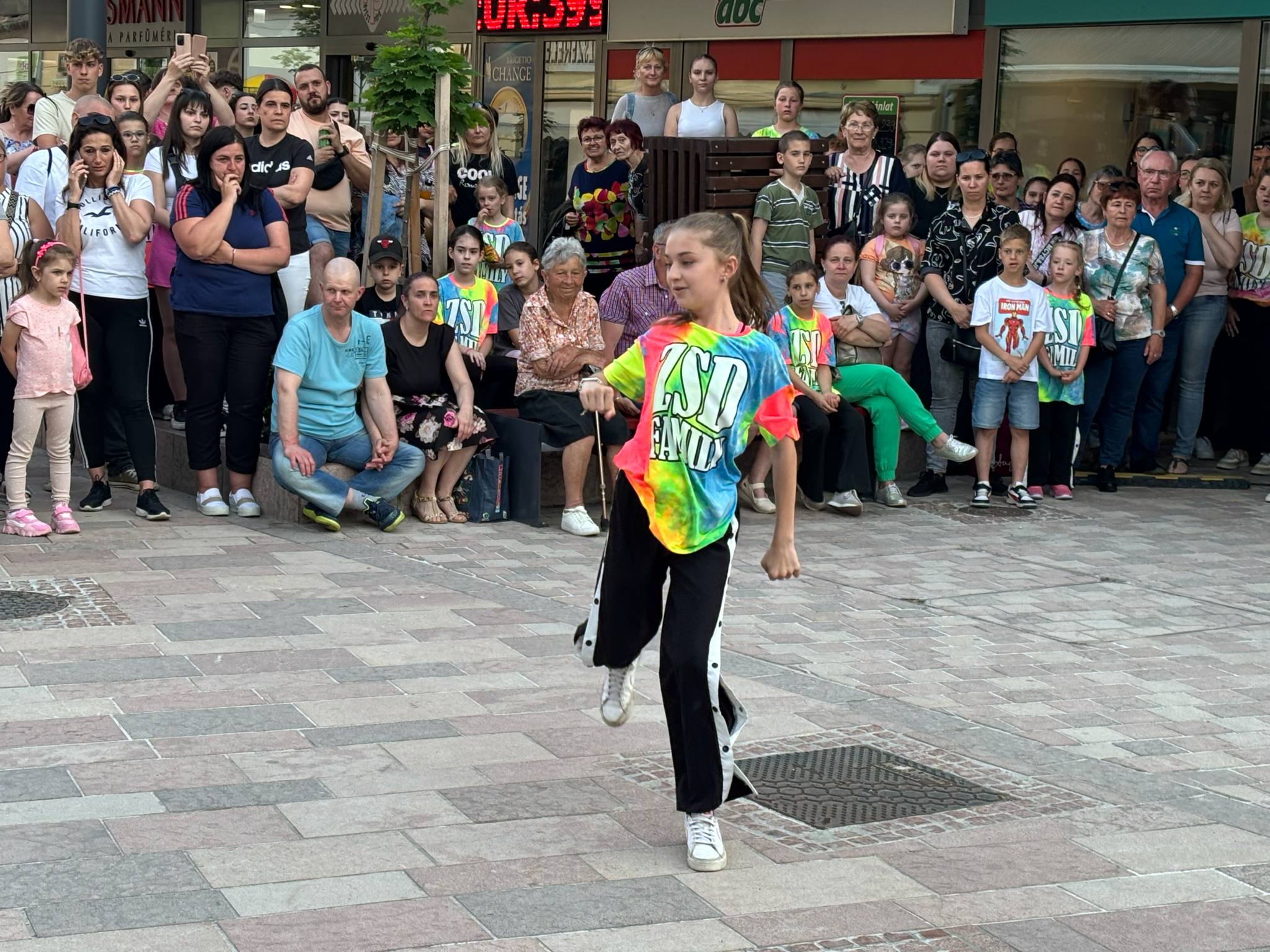 A napos, nyárias időben teljesen megtelt a Kossuth utca, a Belvárosi Forgatag soron következő rendezvényén, amely a Tánc Világnapja alkalmából, a Vadvirág Művészeti Egyesület szervezésében jött létre.
