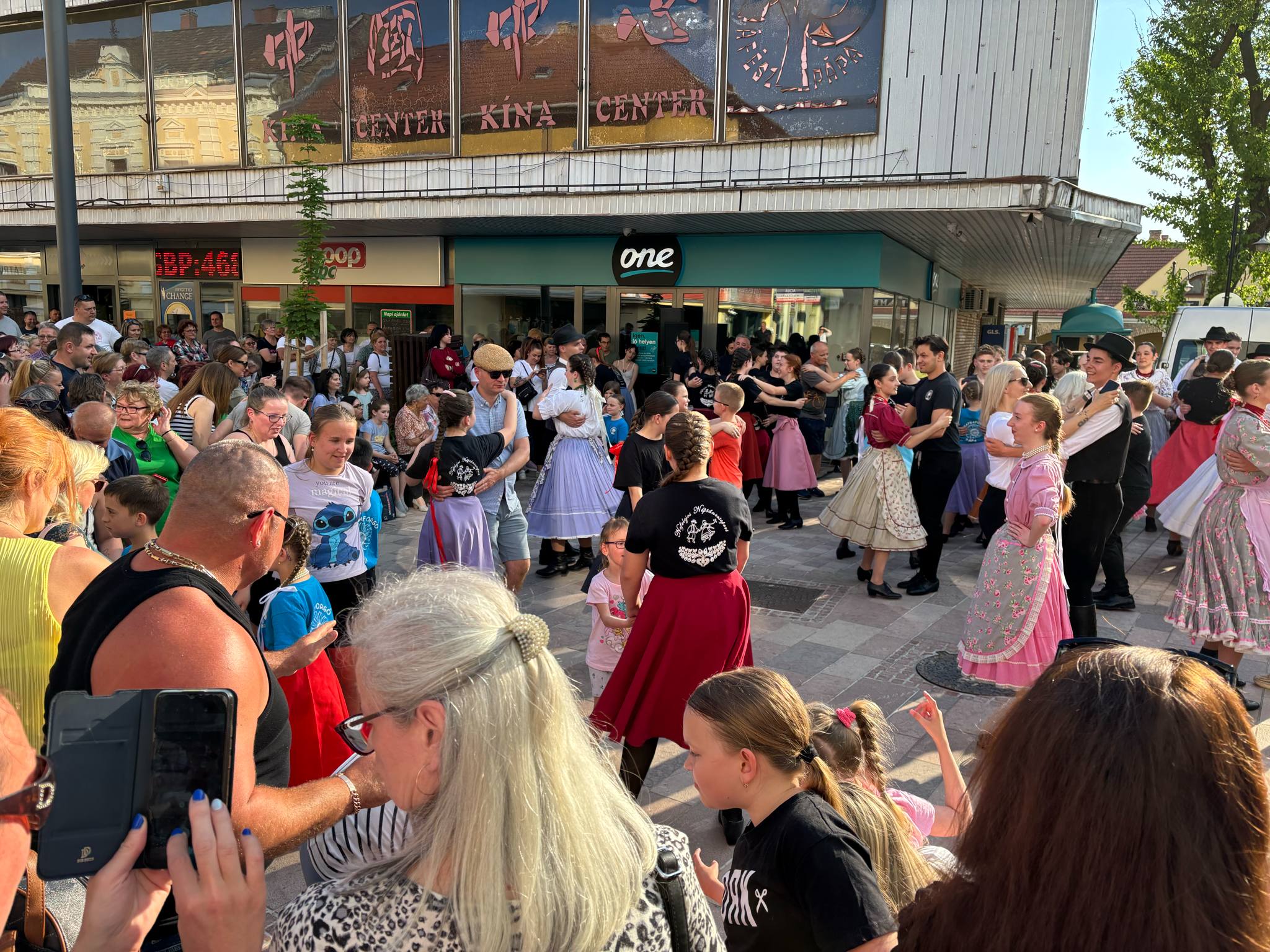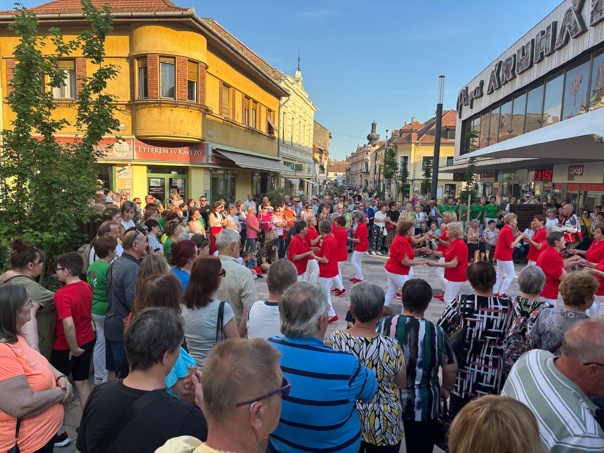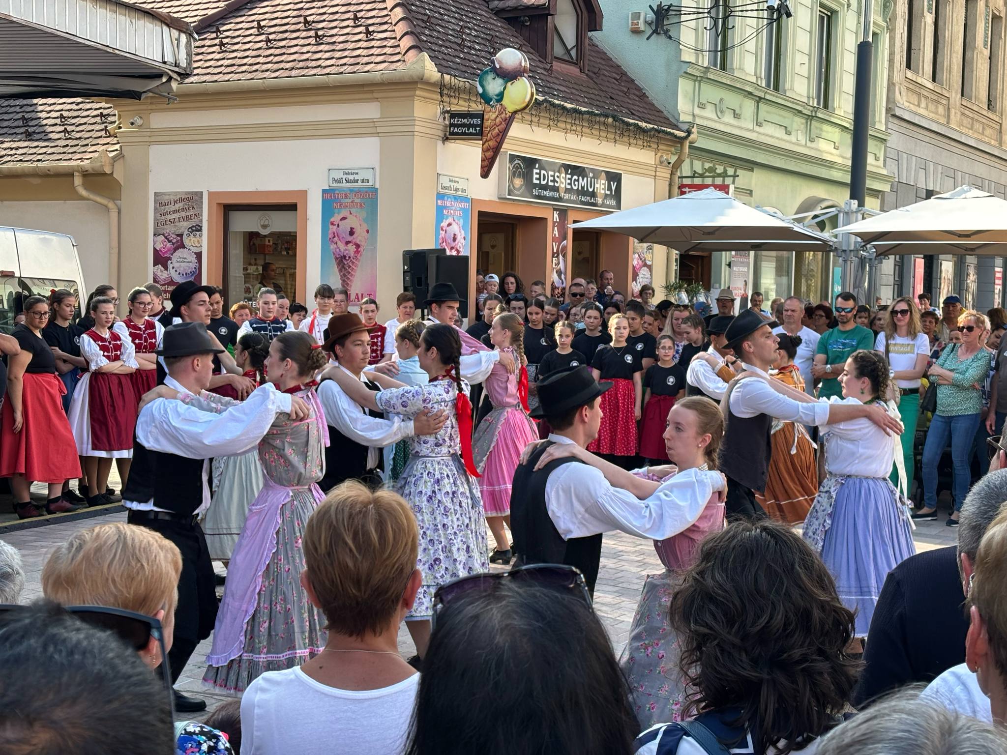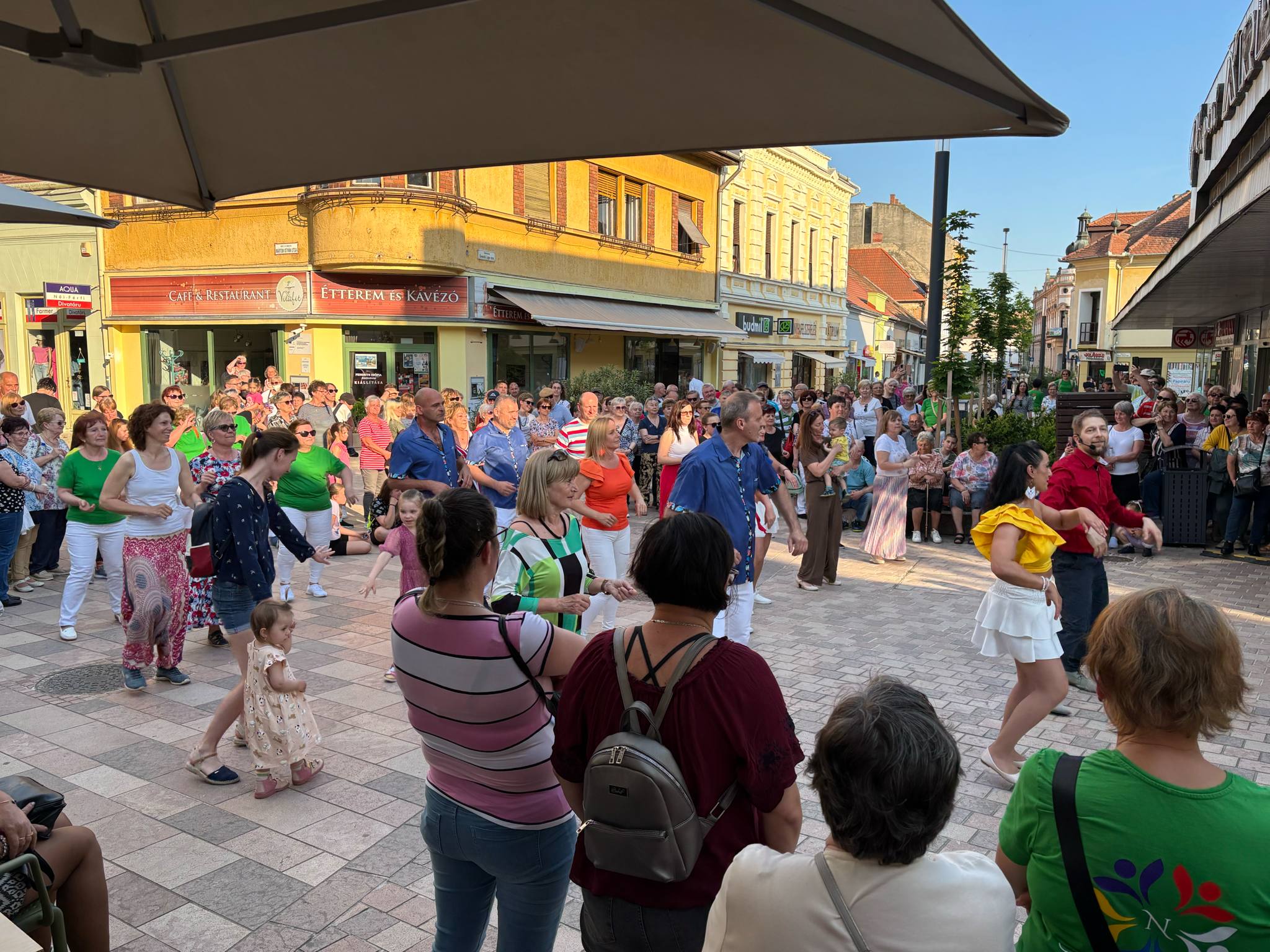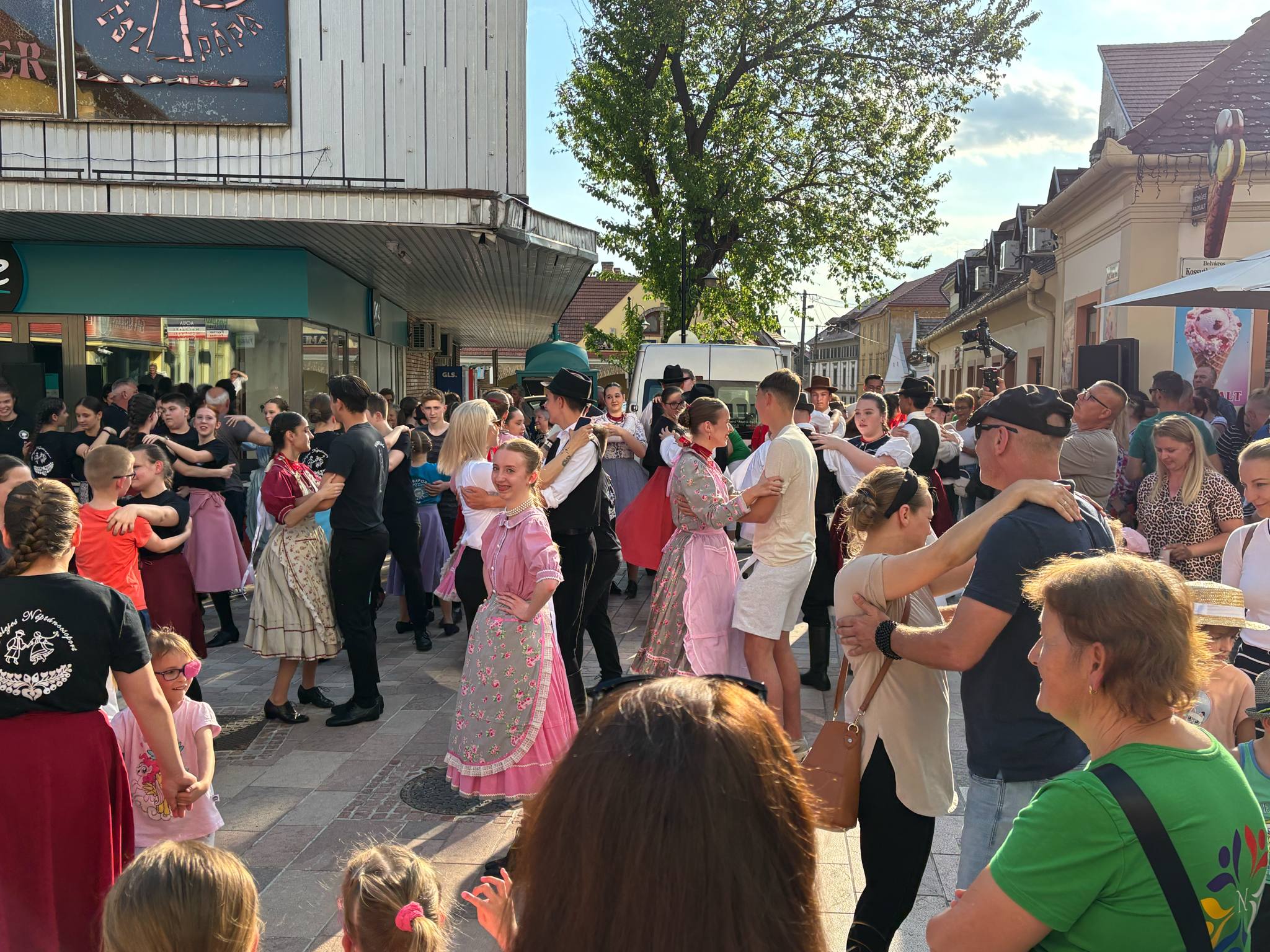 A napos, nyárias időben teljesen megtelt a Kossuth utca, a Belvárosi Forgatag soron következő rendezvényén, amely a Tánc Világnapja alkalmából, a Vadvirág Művészeti Egyesület szervezésében jött létre.