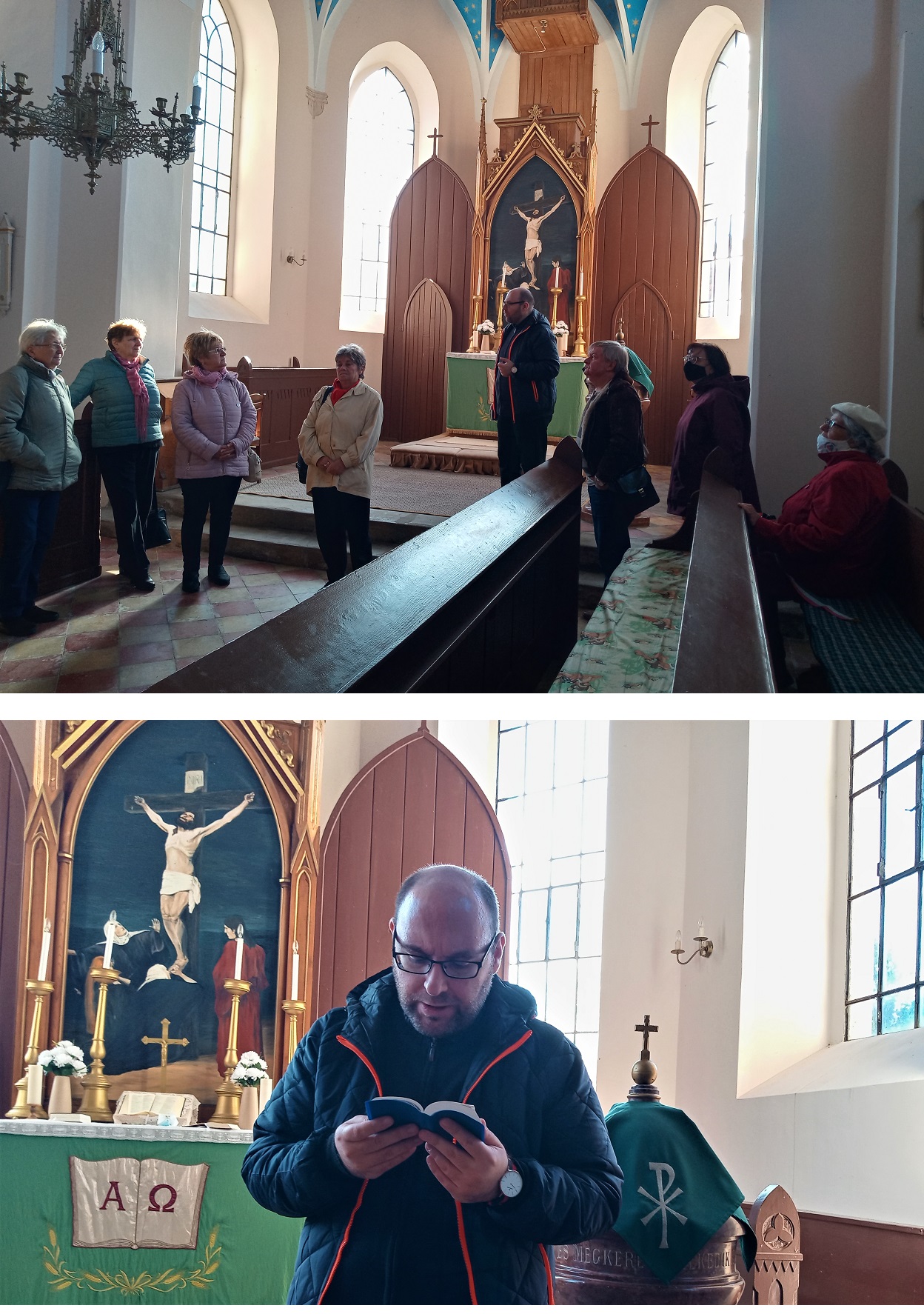 Küldöttségünk következő állomása a Pápától tizenöt kilométerre lévő Marcal-medencei kis község, a Veszprém és Vas megye határán fekvő Marcalgergelyi volt. A reformáció időszakában protestált, „hétszilvafásokká” lett, a földdel a földért élő pápai, Pápa környéki Kerecsényiek ősi fészke. Itt született, növekedett apai nagyapám, itt született, élt, halt dédapám, ükapám, szépapám, stb. Ezért aztán önkéntelenül megdobbant a szívem, amikor EpVE-s önkéntes társaimat bevezethettem a több mint száztíz éves marcalgergelyi lutheránus templom falai közé. Megálltam amellett a vörösmárvány keresztelőkút mellett, amely felett anno apámat, nagyapámat, dédapámat is keresztelték. Október 20-a lévén, meglepetésként, a nap emlékére felolvastam a jelenlévőknek a 20. Zsoltárt, valamint beszéltem-meséltem nekik a község és a templomépület múltjáról.