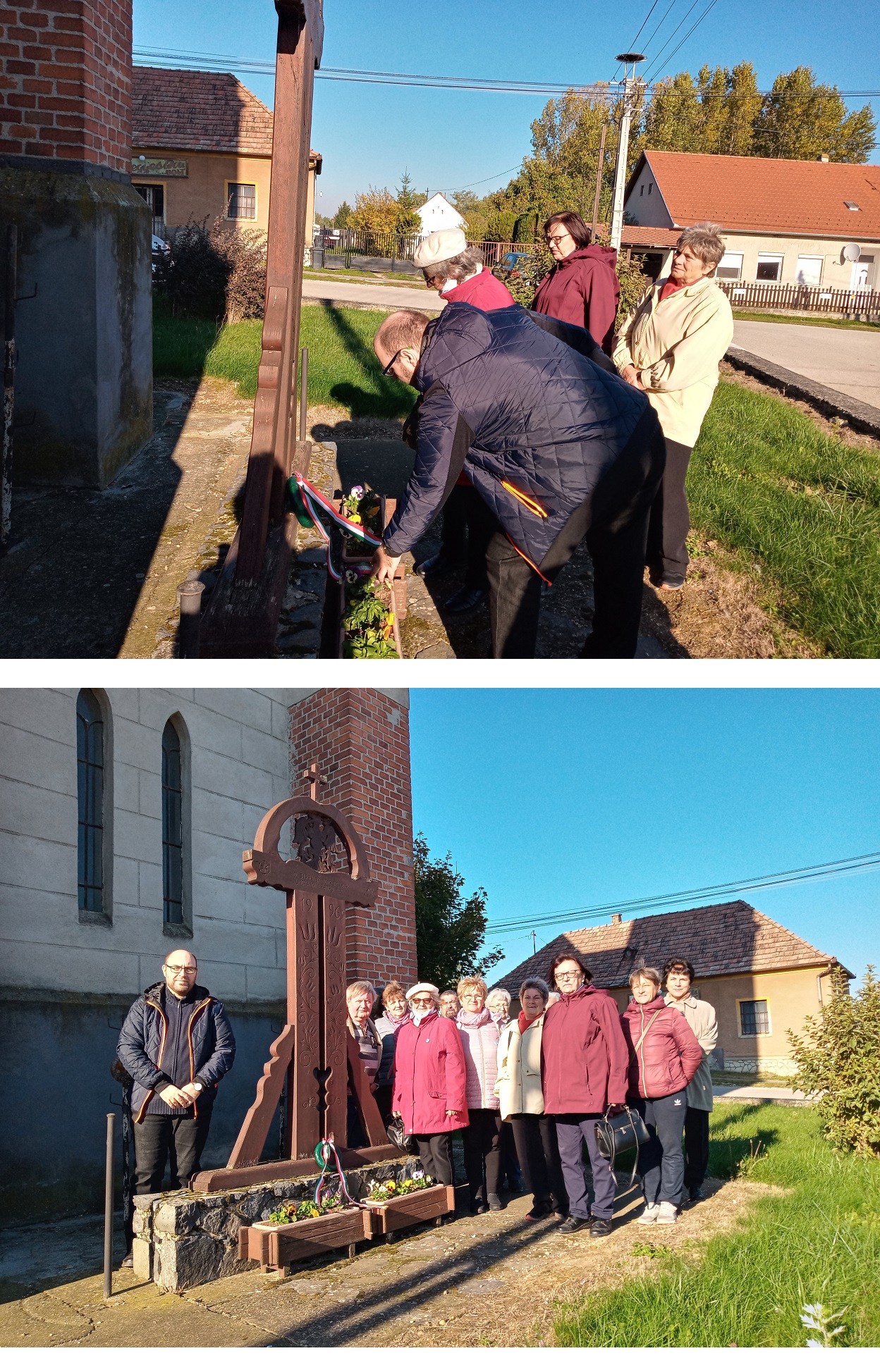 Így a gergelyi templom előtti emlékműhöz a Perlakyakra emlékezve-emlékeztetve tettük le nemzeti szalaggal átkötött koszorúnkat kedves egyleti önkéntesünkkel, Kovácsné Vajda Edit nyugdíjas pápai tanárnővel, Perlaky-leszármazottal.