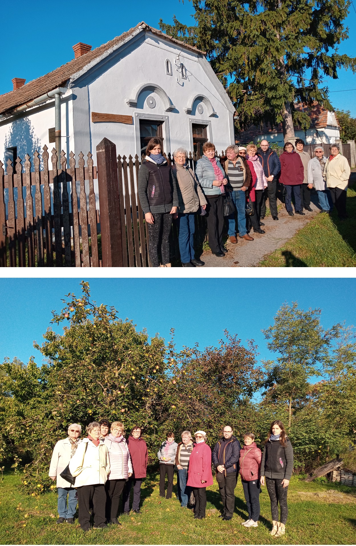 A tájház kertjében még egy igen szép, roskadásig teli almafának is megörülhettünk, melynek gyümölcséből az egyleti hölgyek egyből kóstolót szakajtottak. Ekkor már gondolatban a jeles pomológusnál, Berzsenyi Dániel „falusfelénél”, Ambrus Lajos József Attila- és Berzsenyi-díjas írónál jártunk. Igyekeznünk kellett, hogy ne csak gondolatban, de valóságosan is ott legyünk nála, mert ekkor már valóban várt reánk Egyházashetyén, és nem szerettük volna semmiképpen sem megvárakoztatni, bármennyire is belelendültünk az alma-csemegébe.