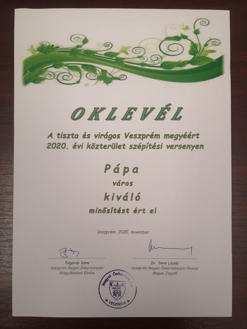 A közelmúltban kapta kézhez a pápai önkormányzat a kiváló minősítésről szóló oklevelet. Pápa évek óta kiválóan szerepel a versenyen.