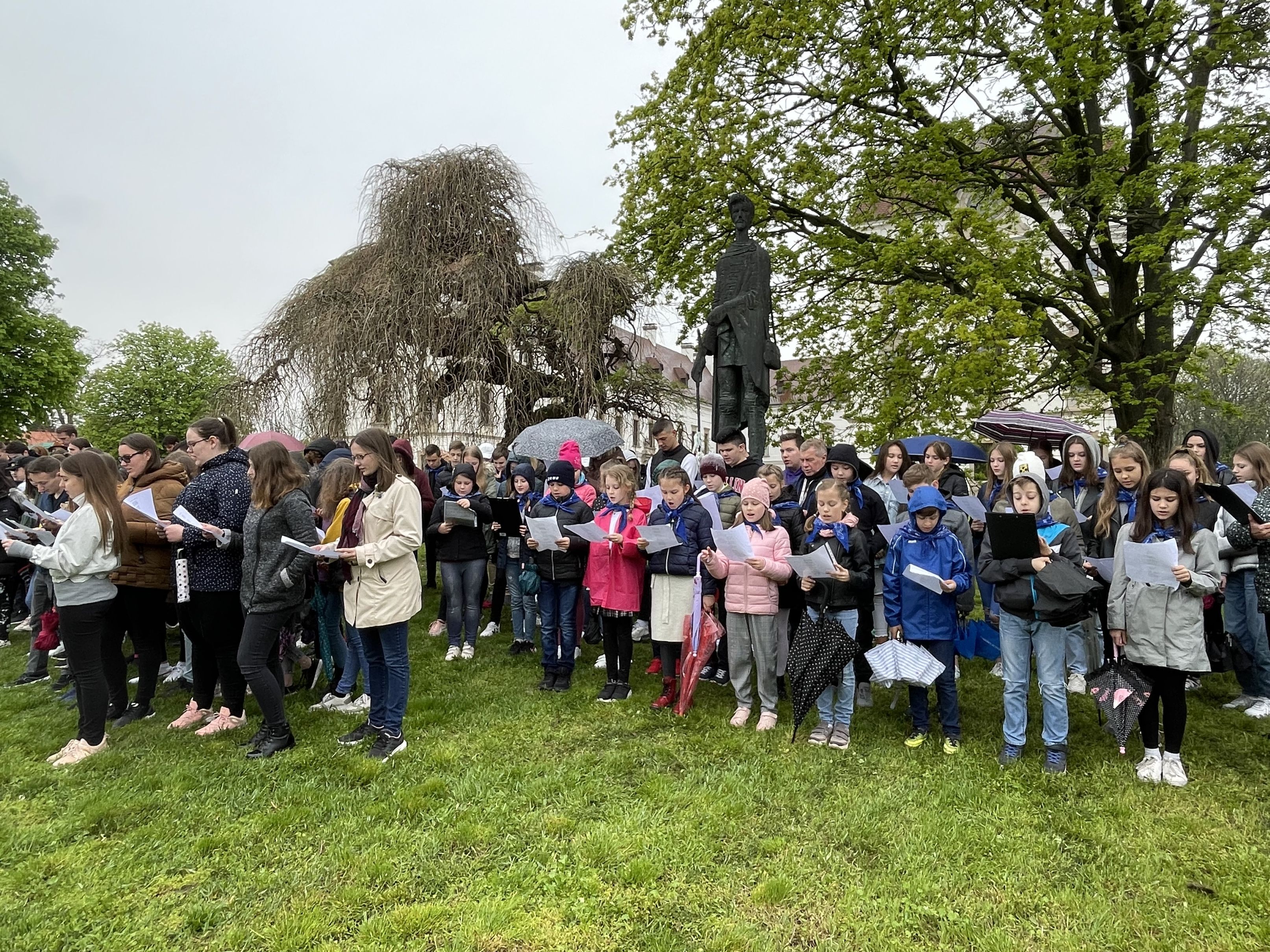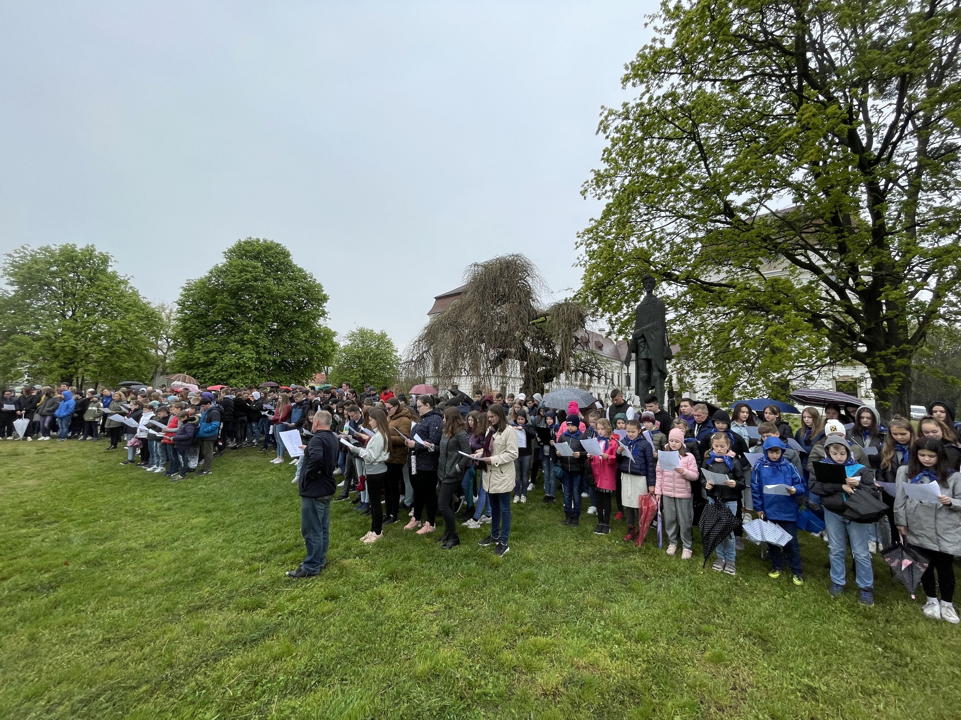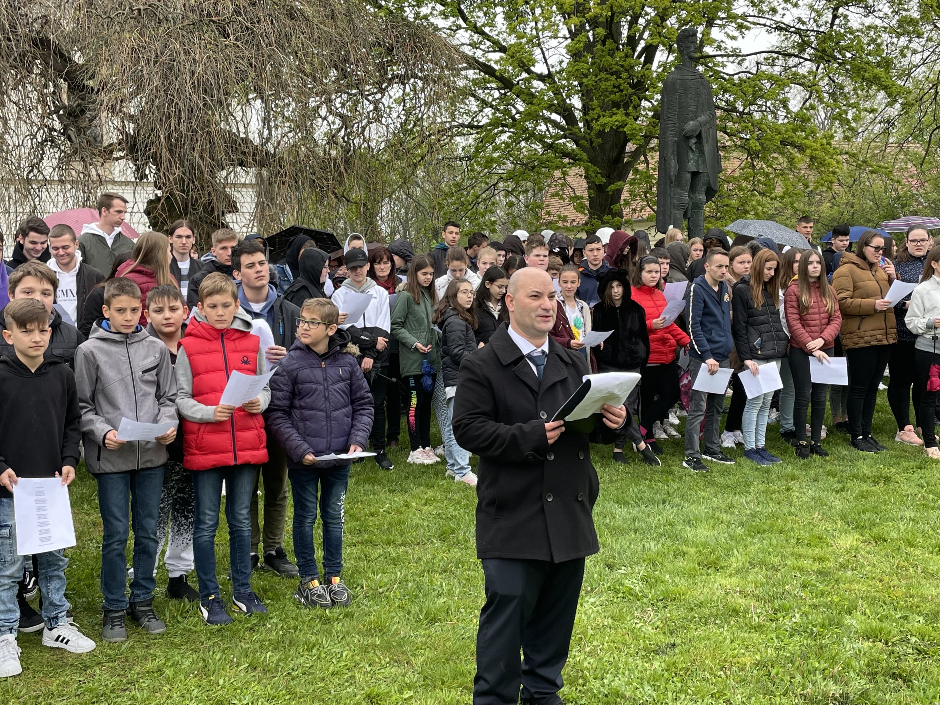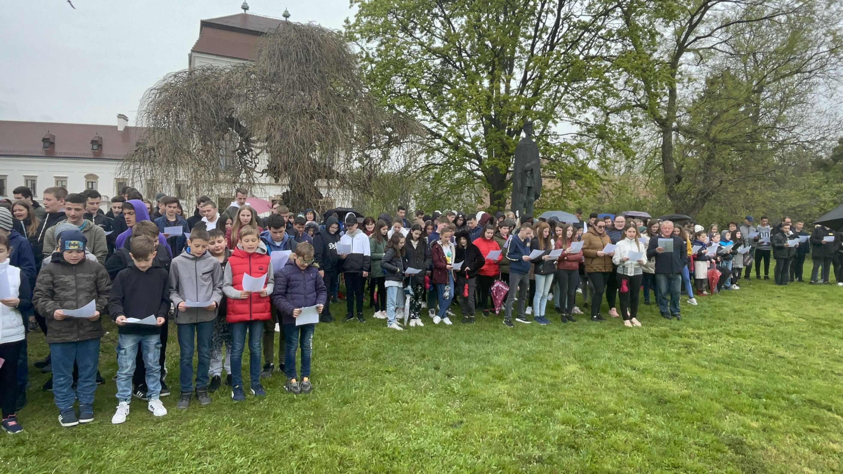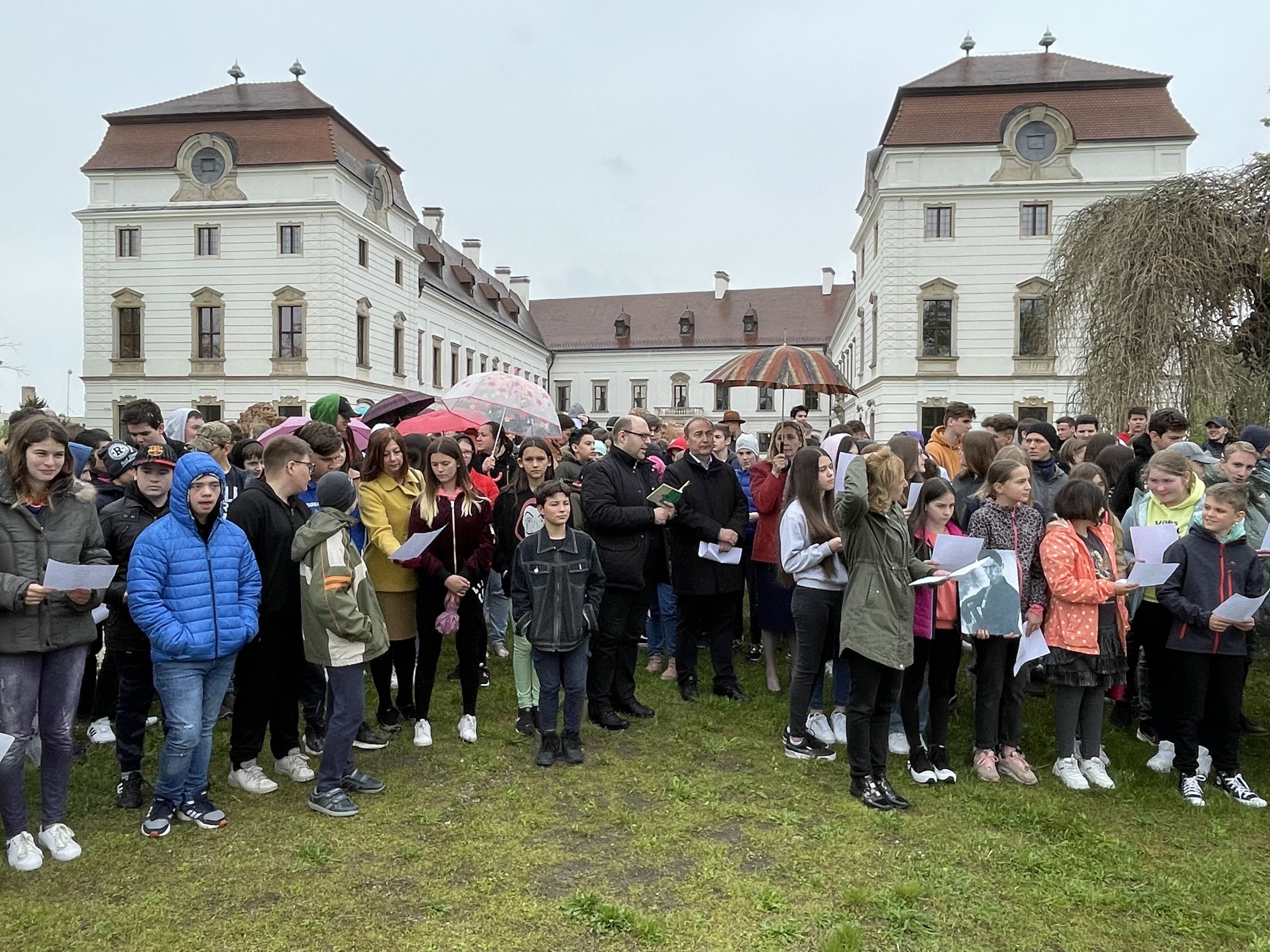 A város számos iskolájából érkeztek diákok az Esterházy-kastély előtti Petőfi-szoborhoz, hogy egy villámcsődület keretében közösen szavalják el a költő Két vándor című versét.