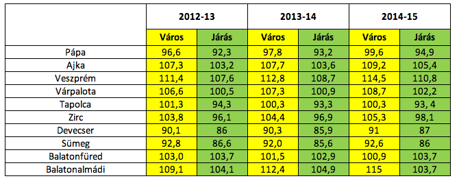 Vásárlóerő-paritás Veszprém megye városaiban (100 = országos átlag)