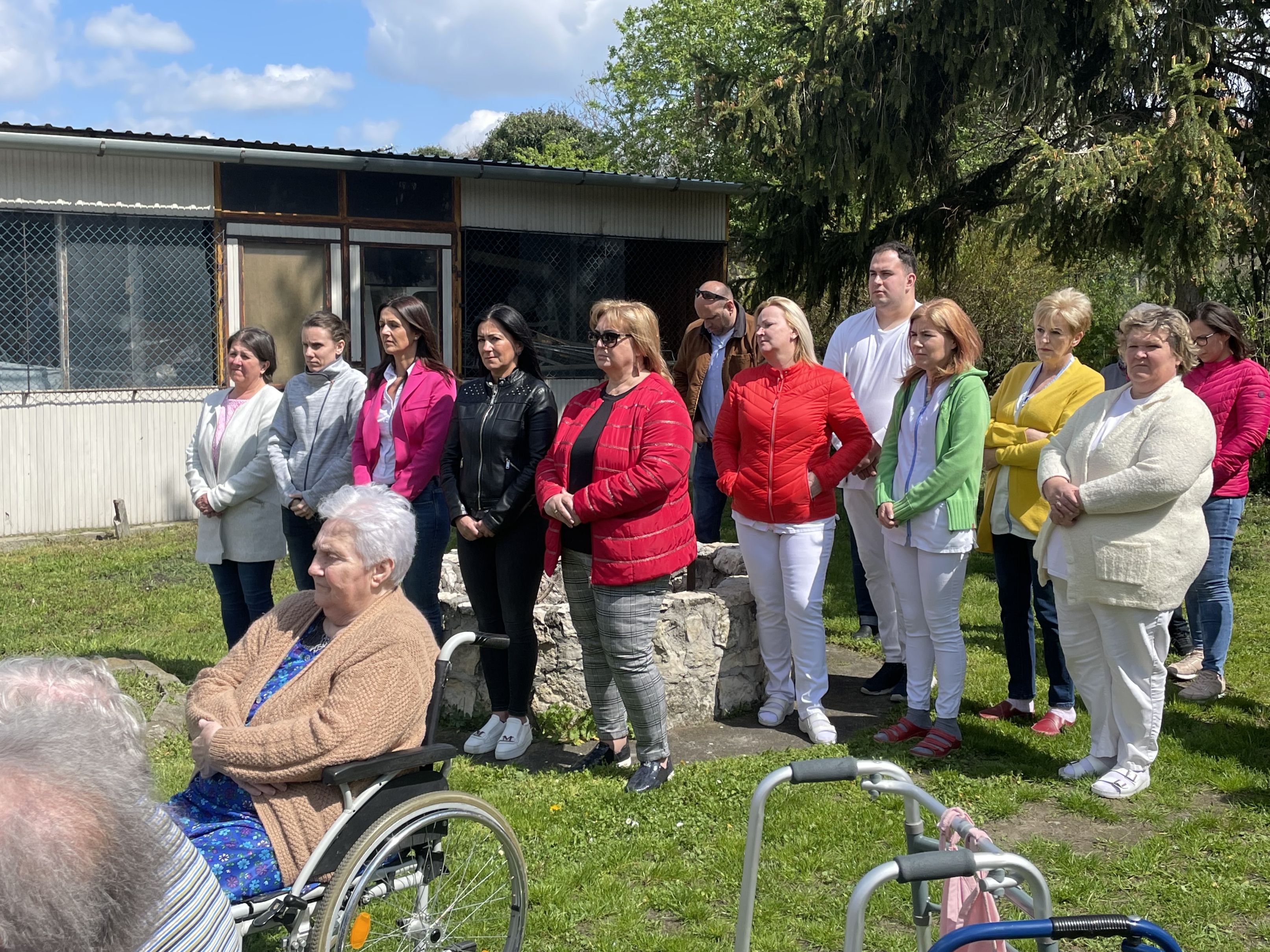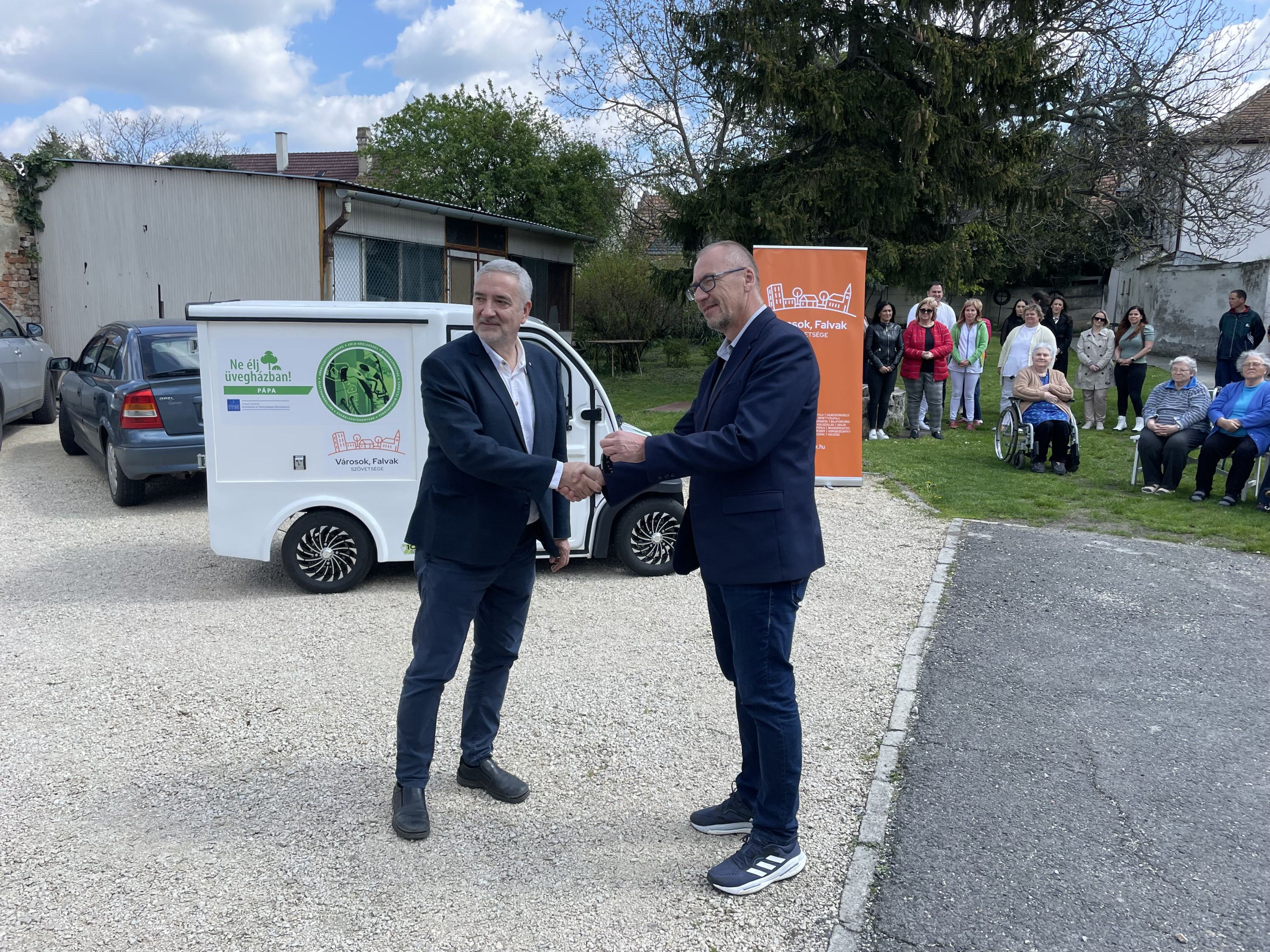 Dr. Áldozó Tamás polgármester köszöntötte az autó ünnepélyes átadása kapcsán összesereglett munkatársakat és az idősek otthonának lakóit. A városvezető köszönetet mondott a Városok és Falvak Szövetségének, hogy Pápára is kerülhetett egy ilyen kis autó.