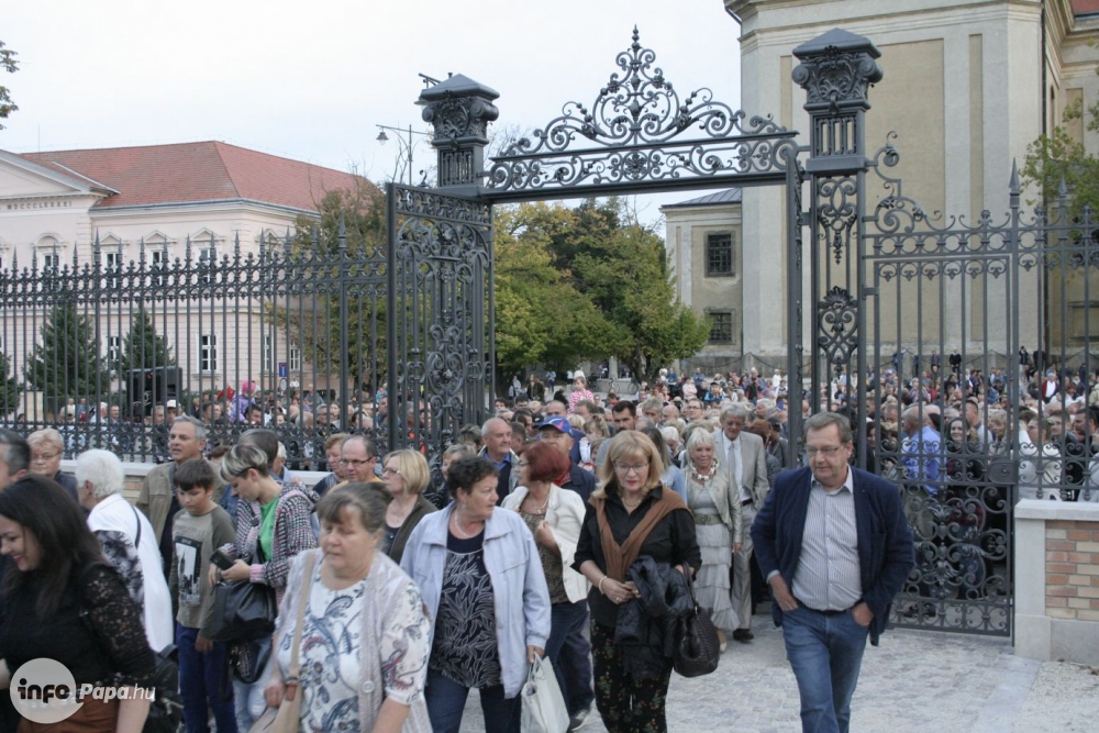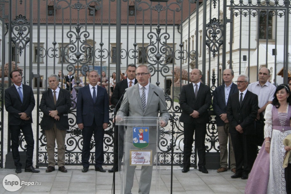 A tömeget dr. Áldozó Tamás polgármester köszöntötte, felidézve, a szentendrei művésszel először kilenc évvel ezelőtt egyeztettek a kapu újra alkotásáról, ám akkor még nem látszott a nagyszabású munka fedezete. 2015-ben lépett előre az ügy, amikor a felújított Esterházy-kastély átadó ünnepségére Pápára érkező Lázár János miniszter megkérdezte, hogy milyen tervei vannak még a városvezetésnek a kastély környezetében. Akkor a kastély kapujának helyreállítását jelölték meg és Lázár János ígéretet tett arra, hogy a Miniszterelnökség fedezetet biztosít a munkálatokra – idézte fel a polgármester.