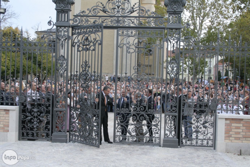 Ünnepélyes keretek között, népes pápai közönség előtt átadták a pápai Esterházy-kastély újra elkészített kovácsoltvas kapuját és teljes körűen felújított kerítését.