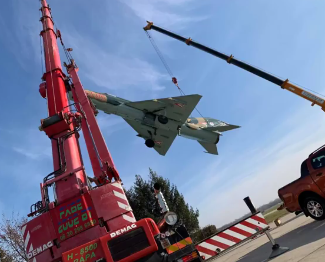 Próbaemelést tartottak ma délután a Bázisrepülőtéren, így a hamarosan a Celli úti körforgalomba kerülő vadászgép egy daru segítségével újra elemelkedhetett a talajtól.