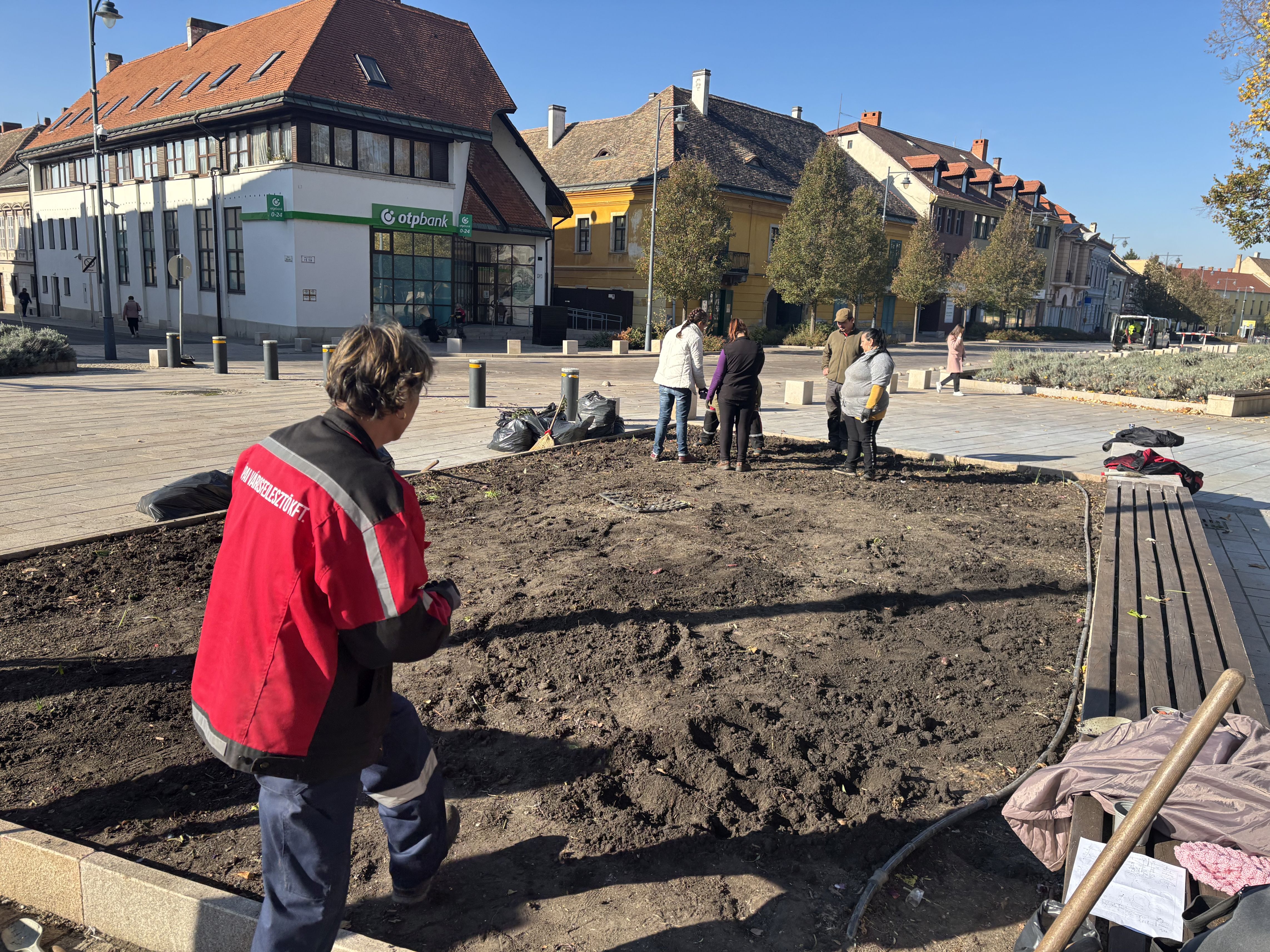 A Fő téren dolgoznak a zöld területek megújításán is, előkészítik a karácsonyfa helyét, ahol tulipán hagymákat is ültetnek, hogy színpompás virágokkal köszöntse a Fő tér a tavaszt.