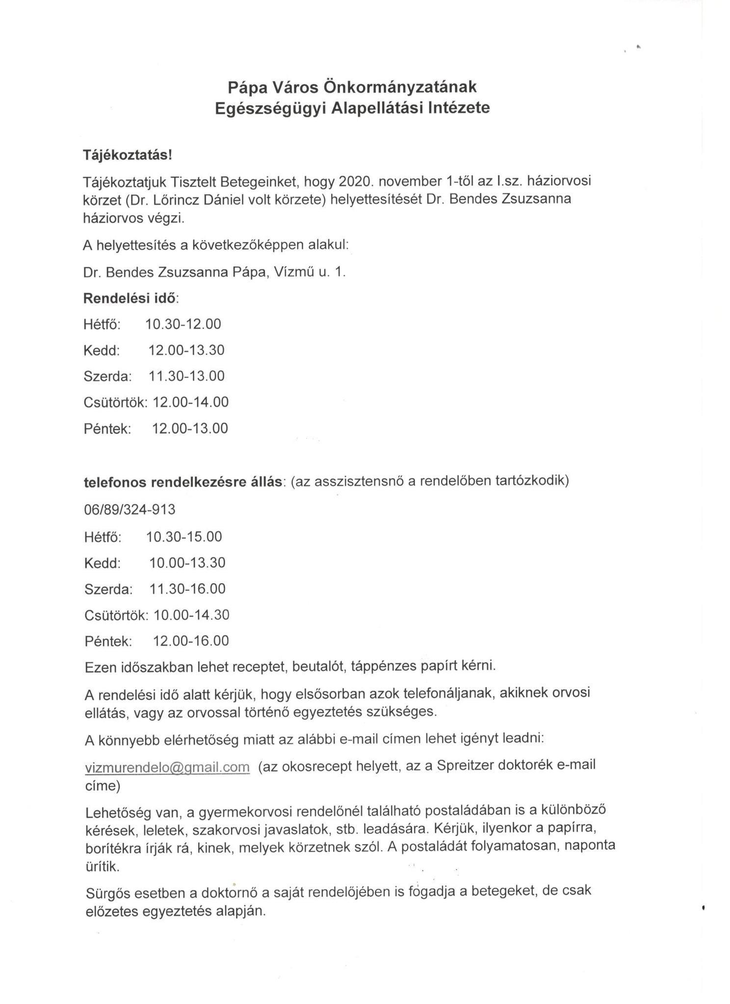 Az I. számú háziorvosi körzet (Dr. Lőrincz Dániel korábbi körzete) helyettesítését november 1-től Dr. Bendes Zsuzsanna háziorvos végzi - írja Pápa Város Önkormányzatának Egészségügyi Alapellátási Intézete.