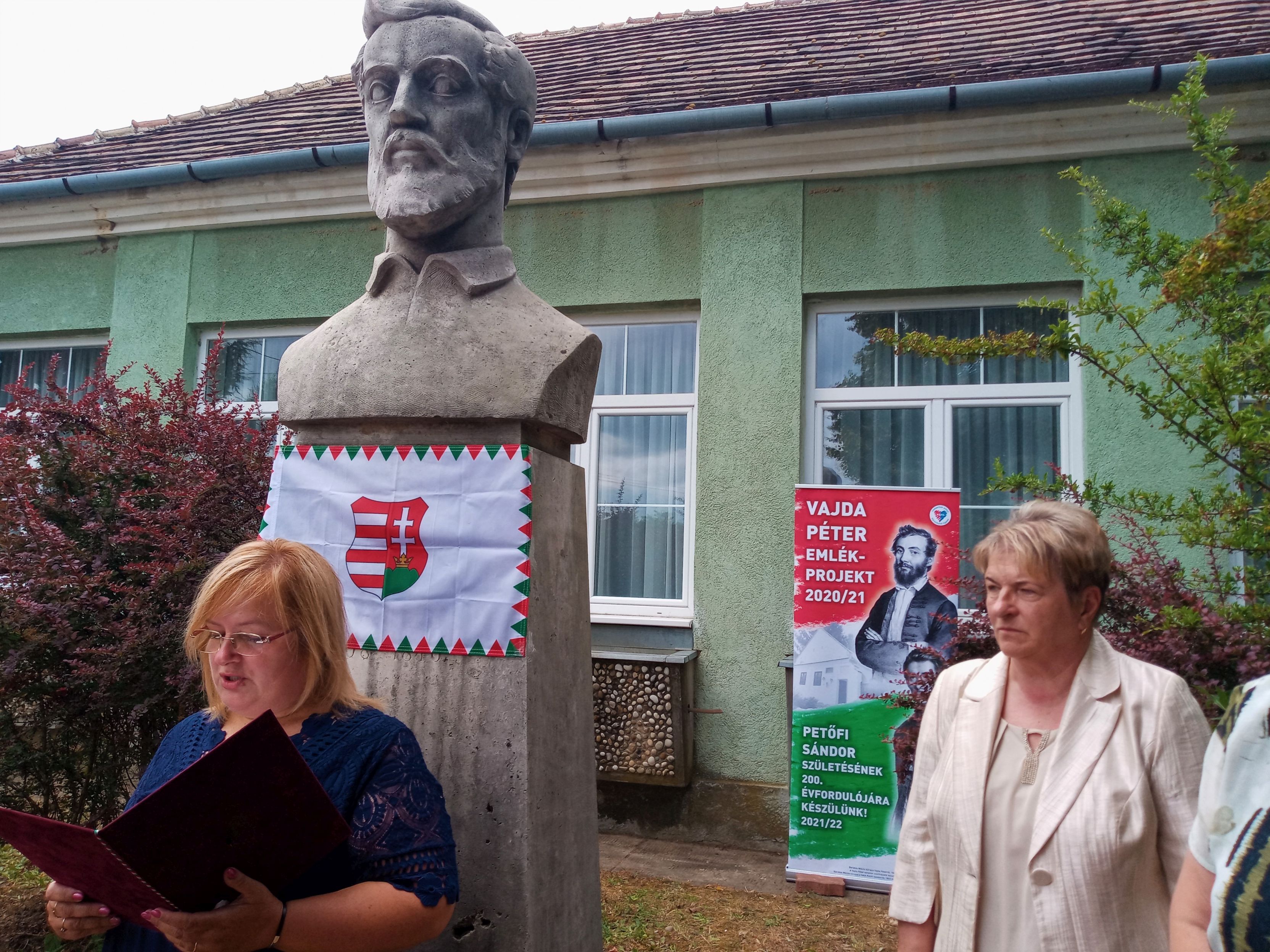 – Fontosnak éreztük, hogy az Elsősorban pápai Városbarát Egylettel a futó Vajda-emlékprojekt keretében – a pápai emlékjelek mellett – idén Vajda Péter mellszobránál is fejet hajtsunk; illetve ezen szobor alkotójáról, a tragikus halált halt néhai jeles művészről, Tar Istvánról is megemlékezzünk. Vajda Péternek, idei 175. halálozási évfordulóján túl más évfordulója is van. 190 éve, az 1831. évi kolerajárvány alkalmával keveredett ártatlanul gyanúba, hogy az egyik egyetemi orvostanár ellen intézett utcai tüntetést ő rendezte. Midőn az orvosi kar e miatt vizsgálatra jelentkezésekor mindig azt követelte tőle, hogy tisztázza magát, ártatlansága tudatában, büszke dacból vonakodott a magyarázkodástól és rövidesen lemondott az orvosi pályáról. 180 éve, 1841-ben választotta tagjául a korabeli irodalmi ízlés fejlesztésének, s a hazai szépirodalom támogatásának fontos irányító szervezete, a Kisfaludy Társaság. Kortársai már életében példaképnek tekintették Vajda Pétert; leginkább Petőfi Sándor, aki a függetlenség bajnok férfijának nevezte – emlékeztetett Varga Rita.
