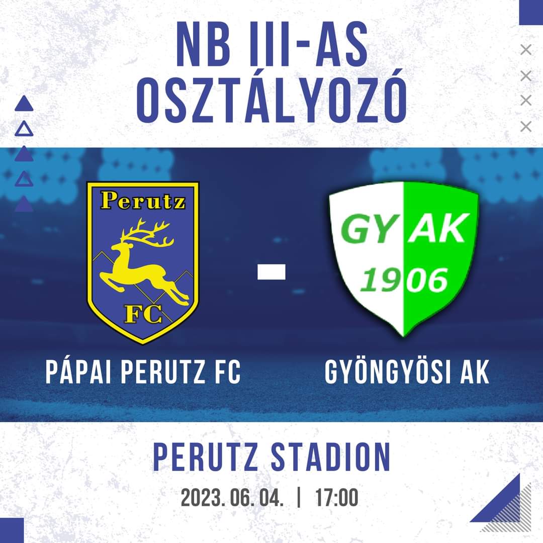 Mint ismeretes, a Perutz a Veszprém vármegyei első osztály második helyén végzett, ám a bajnok úrkutiak nem vállaták a feljutást, ezért a pápaiak mérkőzhetnek meg a harmadosztályú tagságért. A pápai fiatalok ellenfelét sorsolás útján választották ki, június 4-én vasárnap 17 órától a Gyöngyösi AK csapatával mérkőzhet meg a Perutz a harmadosztályba való feljutásért.