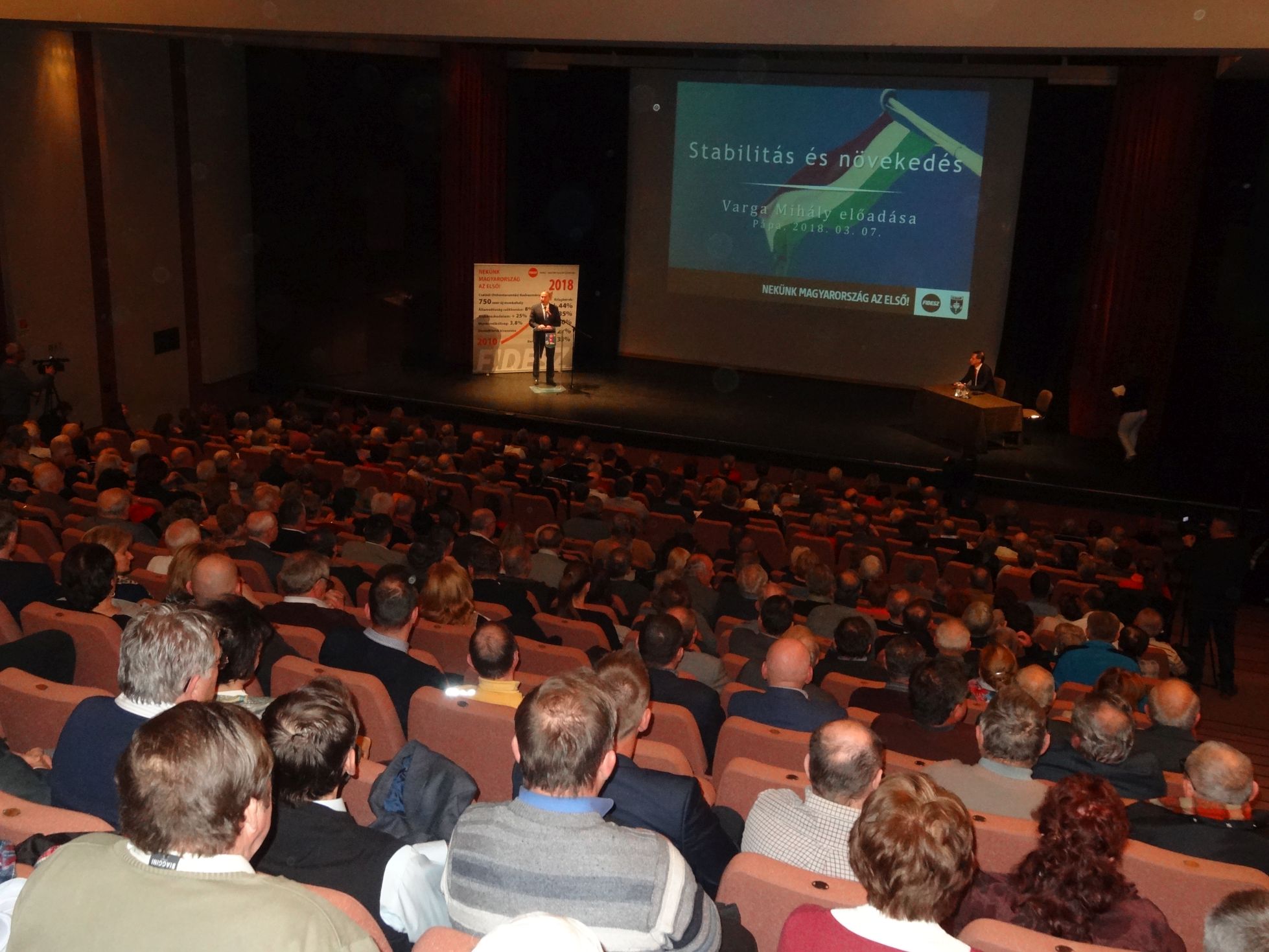 Teltházas előadást tartott a pápai Jókai Mór Művelődési és Szabadidő Központ színháztermében a nemzetgazdasági miniszter, aki dr. Kovács Zoltán országgyűlési képviselőjelölt meghívására érkezett városunkba.