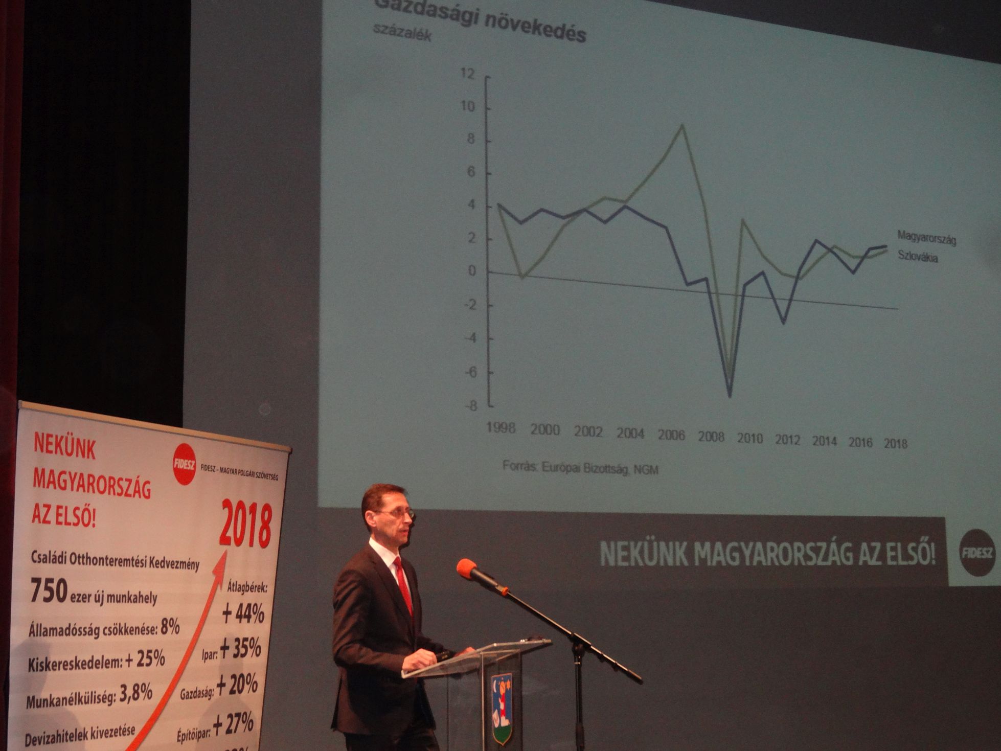 A szakpolitikus a szlovák gazdaság teljesítményét hasonlította össze a magyaréval. Mint mondta, az első Fidesz-kormány éveiben a magyar gazdaság teljesített jobban, 2004-et követően azonban a szocialista kormányok idején jelentős lemaradásba kerültünk szomszédunkhoz képest, miközben az államadósságunk is jelentősen megnőtt. Az elmúlt években - a kormány gazdaságpolitikájának köszönhetően - a két ország gazdasági növekedése nagyjából azonos volt, úgy, hogy közben a magyar államadósság folyamatosan csökkent - húzta alá Varga Mihály.