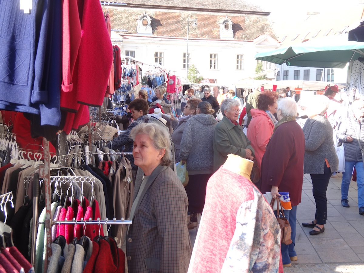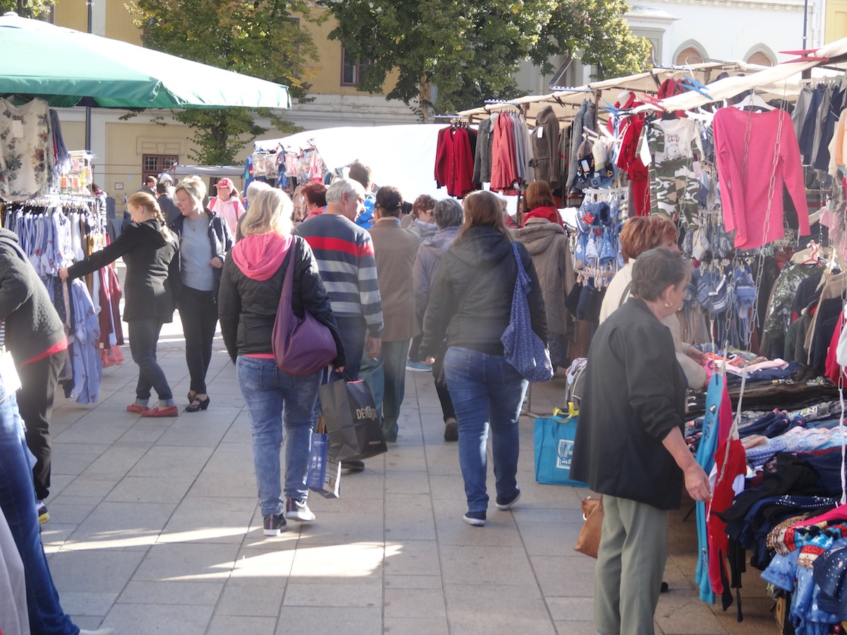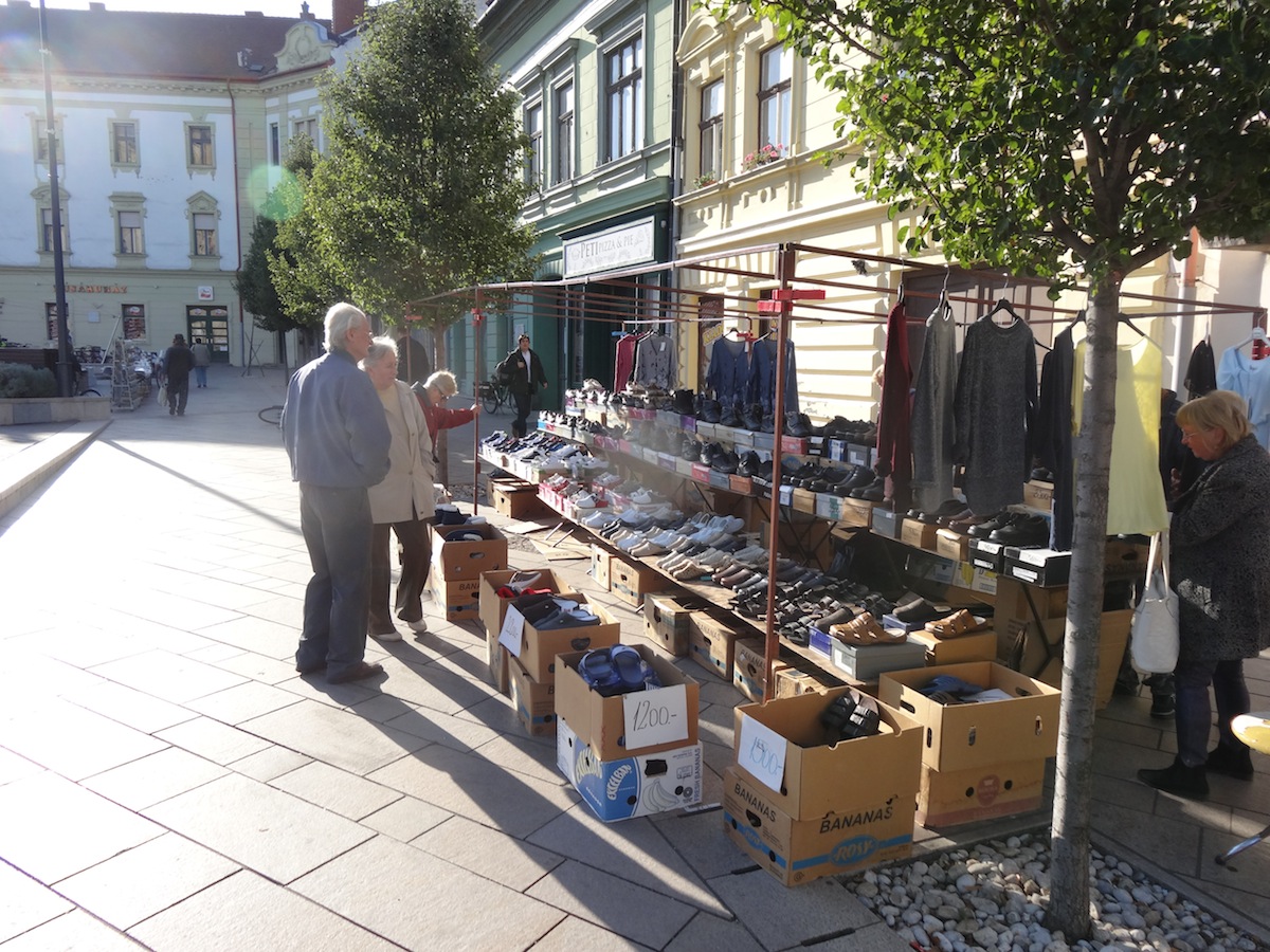 Kedden költöztek a Fő térre a ruhaneműt és iparcikkeket árusítók, követve a gyümölcs- és zöldségpiacot. Akkor a szeles, borongós időben foghíjasak voltak a sorok, most viszont tele van a tér.
