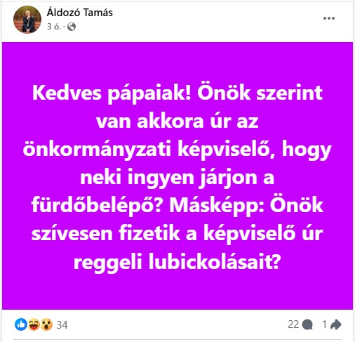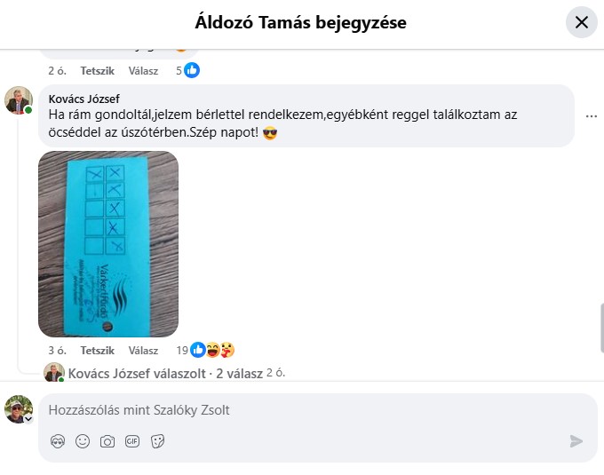 A bejegyzéshez hozzászólt Kovács József önkormányzati képviselő, innen lehet tudni, hogy rá gondolt Áldozó Tamás. Közzétett egy fényképet, amely szerint rendelkezik bérlettel a Várkertfürdőbe. Szintén a hozzászólásokból derült ki, hogy Áldozó Tamás minősíthetetlen stílusban beszélt vele, miután telefonon felhívta őt. Állítólag a beszélgetésről hangfelvétel is készült.