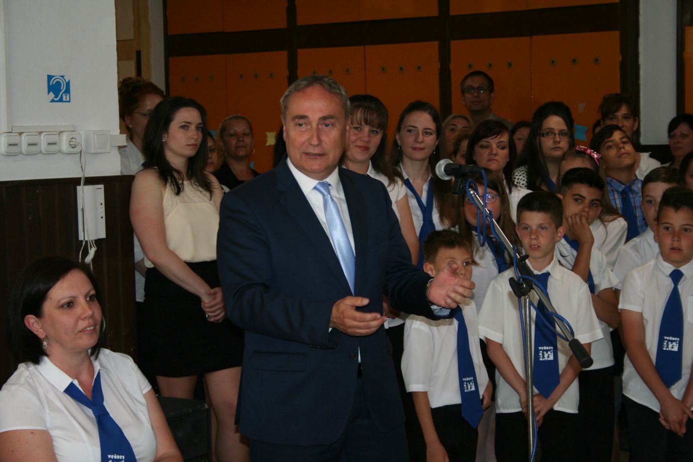 A műsor után az iskola öregdiákja, dr. Kovács Zoltán országgyűlési képviselő köszöntötte az ünnepi hét résztvevőit. A képviselő személyesn hangvételű beszédében a múltidézés játszotta a fő szerepet, majd az iskola jelenlegi tanáraihoz és diákjaihoz szólt. Azt mondta, 60 év egy iskola életében hosszú idő, ez idő alatt sok híressé vált diák koptatta az iskola padjait és remélhetőleg ez ma is így van. - Ebben van nagy felelőssége a tanáraitoknak, hiszen nem mindegy, hogy miként találkoztok az iskolával. Jókedvvel jártok ide, vagy aggódva, szorongva a tanóráktól - mondta Kovács Zoltán, sok sikert és erőt kívánva az iskola minden diákjának és tanárának.